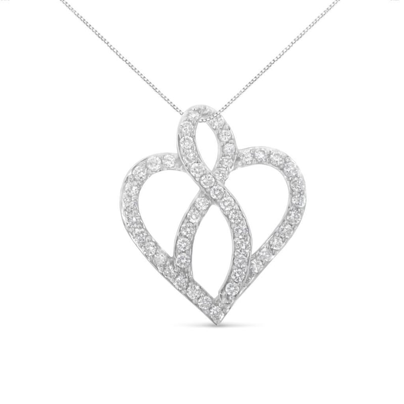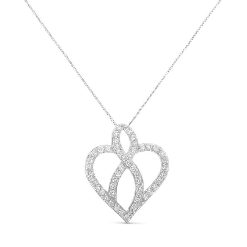 14KT White Gold 1 cttw Diamond Heart Ribbon Pendant Necklace (H-I, I1-I2) This lovely 14k white gold heart pendant necklace features 1 carat of beautiful, natural diamonds. The heart is intersected with a ribbon at its center, and both motifs are embellished with round-cut diamonds in an elegant prong setting. This pendant hangs from a box chain and will add the perfect amount of sparkle to your everyday wear.