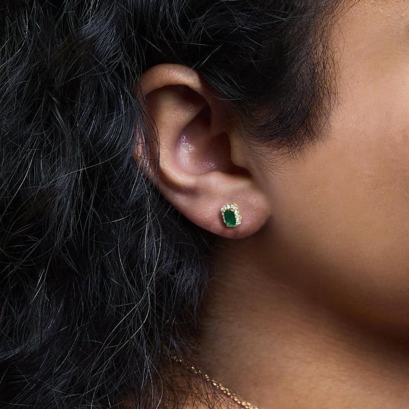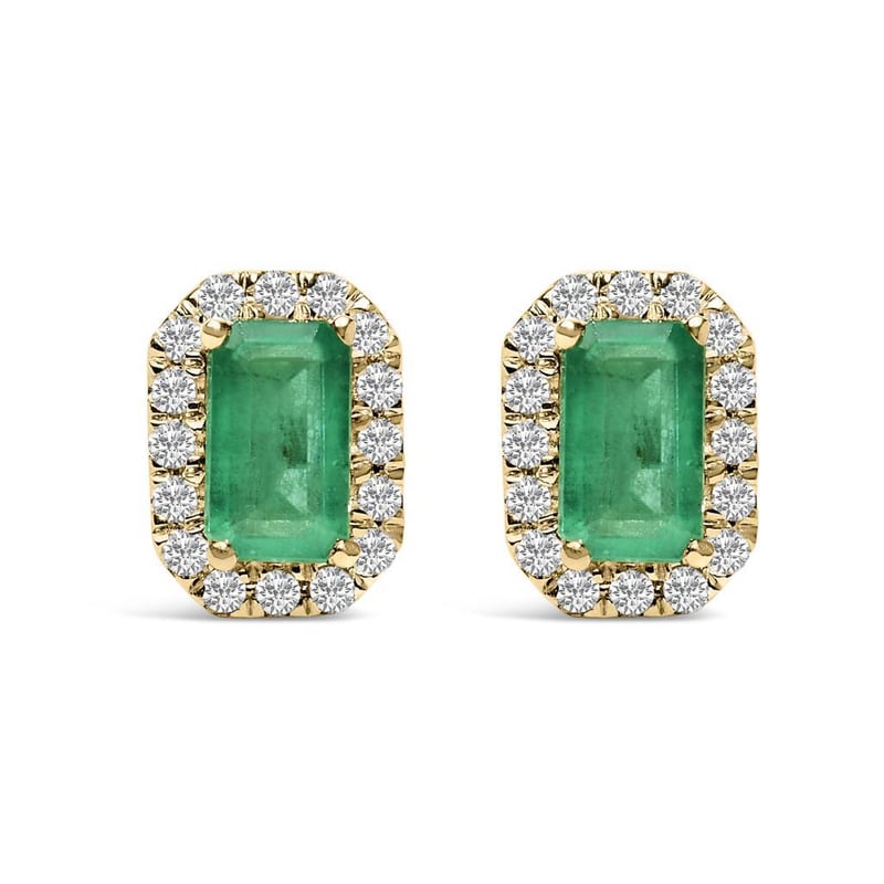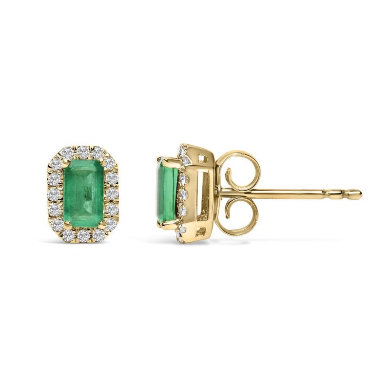 10K Yellow Gold 5x3mm Emerald-Cut Green Emerald and 1/7 Cttw Diamond Halo Octagonal Stud Earrings (I-J Color, I1-I2 Clarity) Envelop yourself in the luxury of these enchanting stud earrings, meticulously crafted from 10K yellow gold. At the heart of each piece lies a vivid 5x3mm emerald-cut, naturally sourced green emerald, epitomizing elegance with its untreated purity. Encircling this sumptuous gemstone is a halo of resplendent natural diamonds, totaling 1/7 Cttw, renowned for their I-J color and I1-I2 clarity. These octagonal treasures promise not only secure comfort with their push-back mechanism but also an air of sophistication to any ensemble. Radiating timeless beauty, these earrings are a tribute to refined craftsmanship and the enduring allure of natural gems. Emerald is natural, and oiled.
