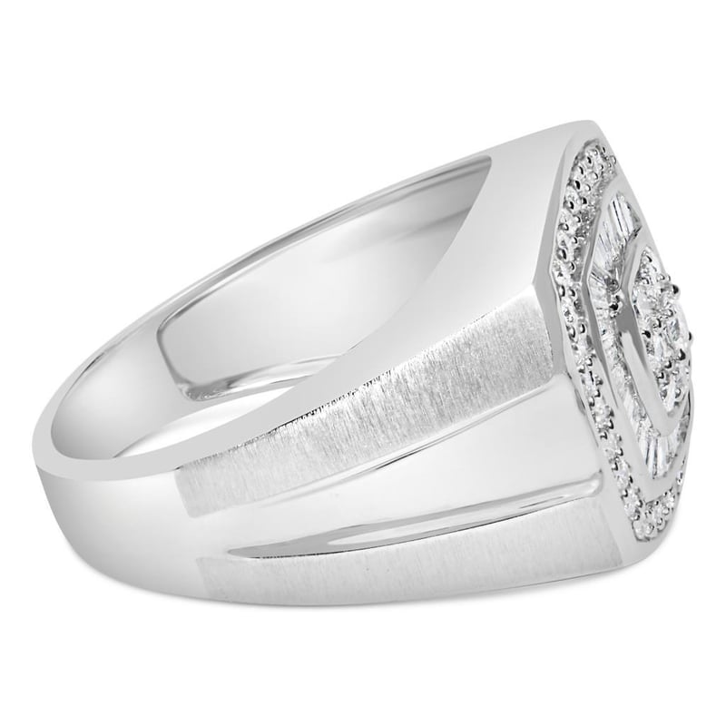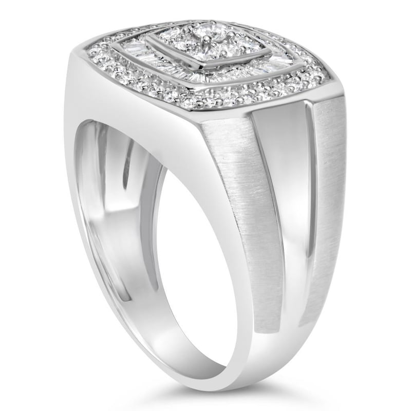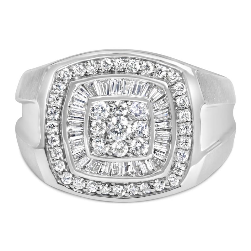 14K White Gold Men's Diamond Band Ring (1 cttw, H-I Color, SI1-I2 Clarity) Vividly created from 14-karat white gold, this men's diamond band is stylish and classic. The top of the elegant ring features a rounded square design. The center flaunts nine round cut diamonds that are prong set into the square pattern. Further, the diamonds are captivated by a halo of sparkling baguette cut diamonds in a channel setting. While the second frame is adorned with a ring of round cut diamonds to add a glittery touch. Make him feel like a king with this diamond band.