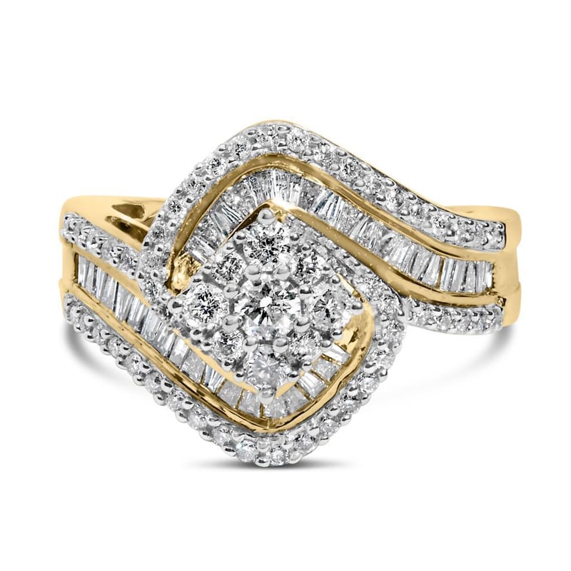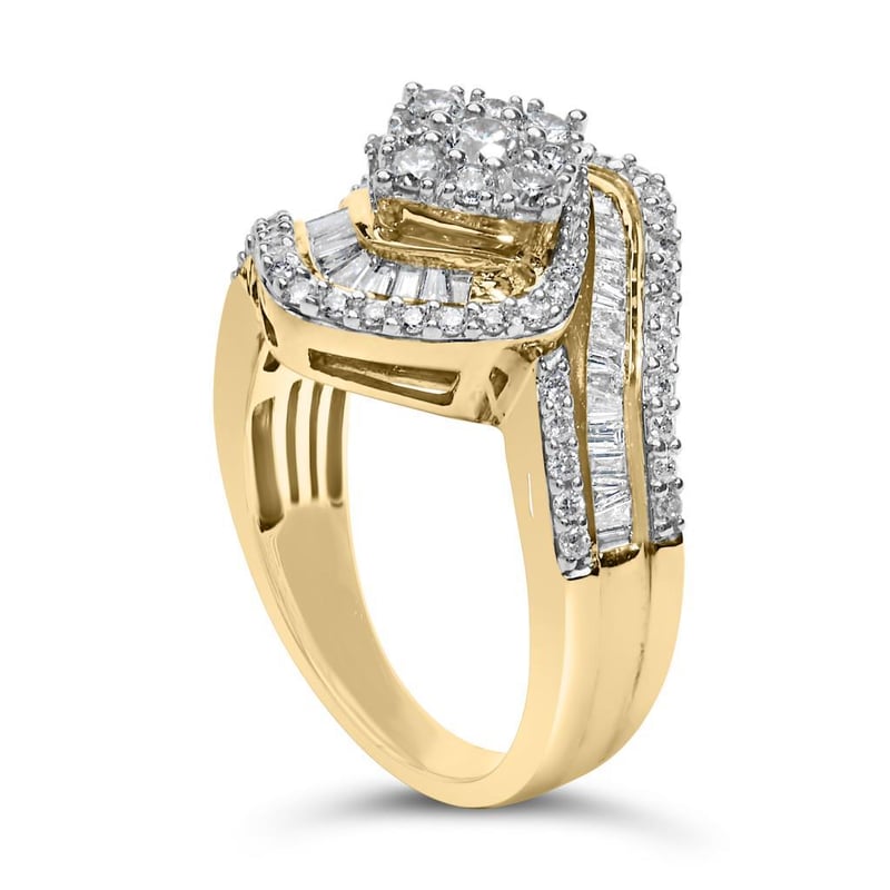 14K Yellow Gold 1.0 Cttw Baguette & Brilliant-Cut Diamond Round Floral Cluster Engagement or Fashion Ring with Swirl Wrapped Triple Row Band (H-I Color, SI2-I1 Clarity) - Size 7 A stunning diamond bypass ring created in 14k yellow gold. This beautiful piece is embellished with round and baguette cut diamonds in prong and channel settings respectively. The total carat weight is 1 carat.