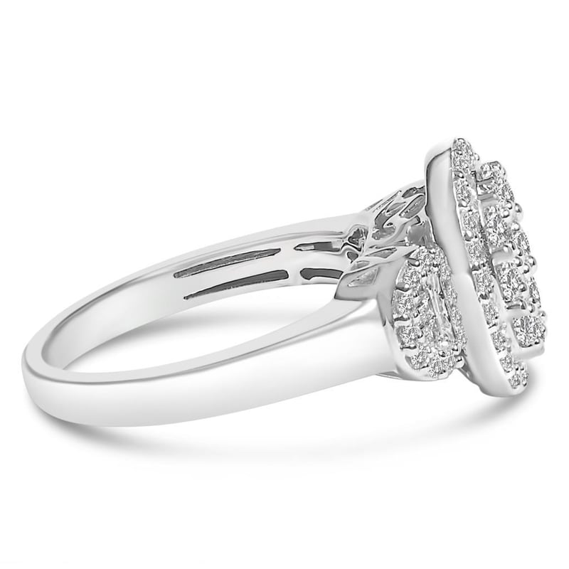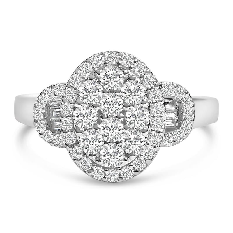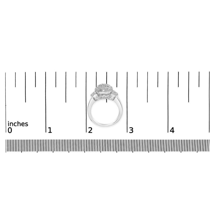 10K White Gold 1.0 Cttw Diamond Oval Cluster with Halo Vintage-Inspired Art Deco 3 Stone Style Statement Ring (G-H Color, SI1-SI2 Clarity) - Size 7 Discover the elegance of eras past with this exquisite 10K white gold statement ring, plated in gleaming rhodium to heighten its luminosity. Natural diamonds totaling 1.0 carats, boasting G-H color and SI1-SI2 clarity, are meticulously arranged to craft an entrancing oval cluster. This central motif is framed by a delicate halo and flanked by artful hints of trapezoid-like shapes, evoking the sophisticated geometry of Art Deco design. The ring's shank is a masterpiece in its own right, adorned with a seamless blend of prong-set rounds and channel-set baguettes that enhance the piece's vintage allure. Designed to captivate and charm, this ring is a symbol of both opulence and artisanal craft, perfect for those who hold a reverence for timeless grandeur and impeccable style.