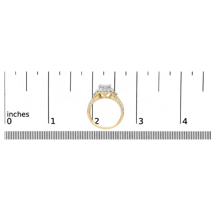 10K Yellow Gold 1.0 Cttw Diamond Composite Cushion-Shape Halo 3-Band-Look Engagement Ring (H-I Color, SI1-SI2 Clarity) - Size 7 Elegant and timeless, this 10K yellow gold diamond engagement ring features 1.07 carat total weight of diamonds with a square cluster of nine princess cut diamonds with a milgrain border haloed by round-brilliant diamonds arranged in a cushion shape. These stones sit atop a high cathedral style setting with an open gallery featuring a V shape. The gallery connects on both sides to a tri split shank each decorated with diamonds. The back of the flat style band has a high shine, polished finish. The ring features 55 diamonds in all. This authentic design is crafted of real 10K yellow gold, ensuring it will keep a tarnish-free shine for years to come. This ring makes a great engagement ring, anniversary ring, promise ring, or statement ring. Diamonds are thought to give the wearer clarity and illuminate solutions to life’s problems, as well as encouraging abundance, strength, harmony, and commitment. Give her a gift that will last forever.