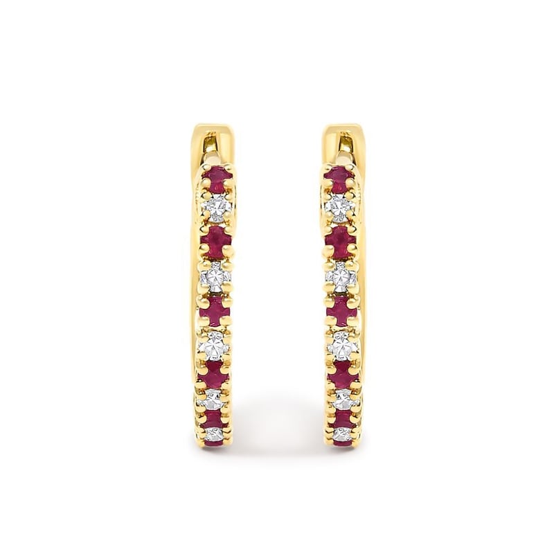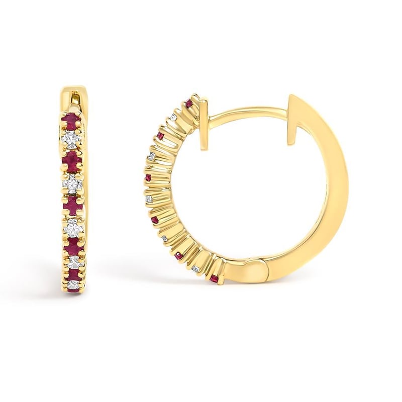 10K Yellow Gold Alternating Diamond and Red Ruby Huggy Hoop Earrings (I-J Color, I1-I2 Clarity) Captivate the senses with these exquisite 10K yellow gold earrings, where each piece delicately balances the scintillating brilliance of natural white diamonds against the deep, passionate hues of round, prong-set natural rubies. Secured with a hinge back for comfort, these Huggy Hoop earrings are a symphony of elegance and vibrancy. The alternating gemstones are masterfully set along a sleek, single row, creating a mesmerizing trail of color and sparkle that dances in harmonious contrast. The diamonds, with their I-J color and I1-I2 clarity, twinkle with an innate fire, while the heat-treated rubies deepen the visual allure, each gem measuring a precise 1.4x1.4mm. This pair promises not only to add a touch of luxury to every ensemble but to become a cherished keepsake in any jewelry collection.