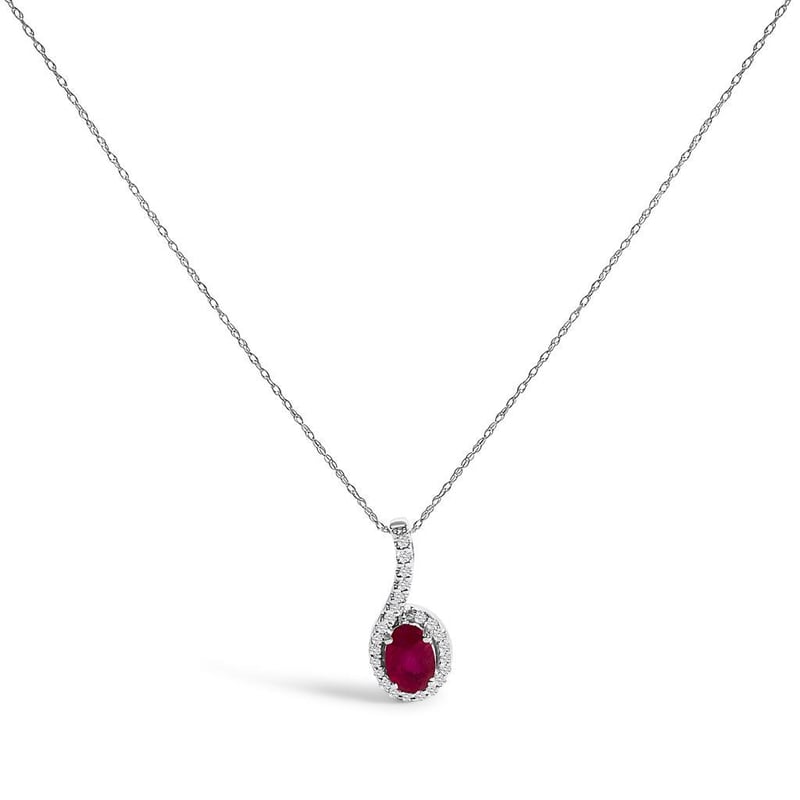 10K White Gold Red Ruby and Diamond Accent Teardrop Pendant Necklace - 18" Inches Discover elegance encapsulated within the 10K White Gold Red Ruby and Diamond Accent Teardrop Pendant Necklace. Crafted with meticulous precision, this rhodium-plated treasure features a mesmerizing 4x6mm oval-cut, heat-treated natural red ruby nestled at its heart, radiating a fiery passion. Enveloping the ruby, the shimmer of natural diamonds with I-J color and I1-I2 clarity cascades like celestial light, their delicate dance enhancing the gemstone's deep, vibrant hue. Suspended gracefully on an 18-inch rope chain and secured with a sturdy spring ring clasp, this pendant radiates sophisticated allure. Perfectly poised to complement every ensemble, it promises to be a timeless addition to your jewelry collection, awakening a world of possibilities with each wear.