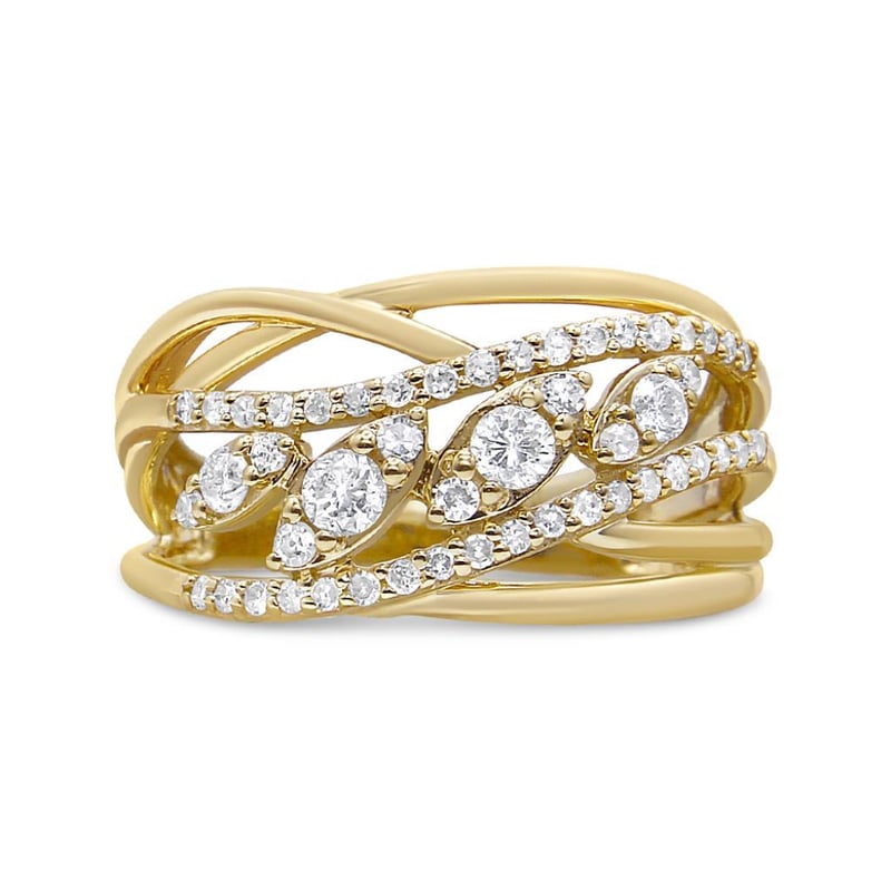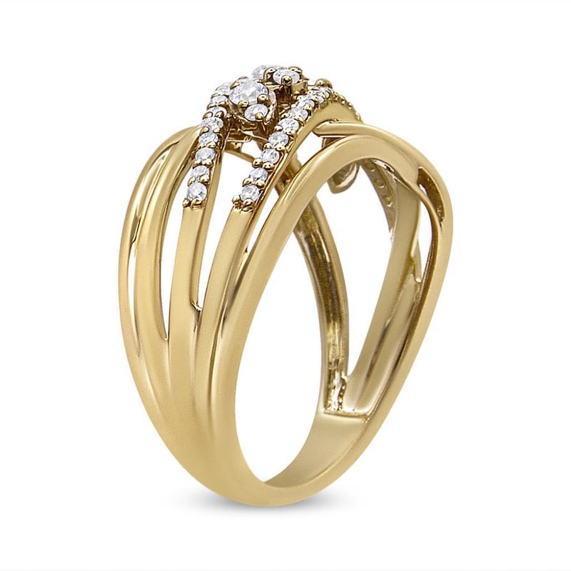 10K Yellow Gold 1/2 Cttw Round-Cut Multi Row Diamond Split Shank Cocktail Ring (H-I Color, SI2-I1 Clarity) - Size 7 Bold and eye-catching, you will love how this 10k yellow gold cocktail ring shines on your finger. Crafted with an intricate split shank design, this ring has a total carat weight of 1/2 c.t. and is brilliantly set with 4 round-cut diamonds as its central motif. The 4 diamonds are flanked by smaller round-cut diamonds on either side in a gold leaf-like motif, and the band is further inlaid with round-cut diamonds of varying sizes. This ring will add a touch of dazzling glamour to your outfit and be the star of your growing jewelry collection.