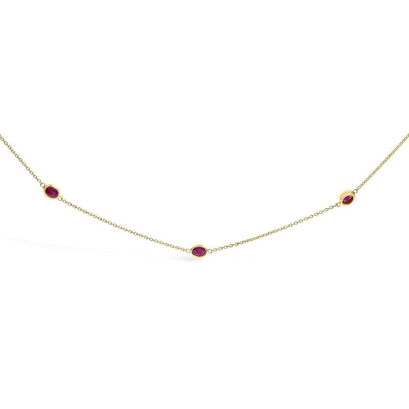 14K Yellow Gold Bezel Set 4x3 mm Oval Red Ruby Station Necklace - 18 Inches Crafted in the lustrous radiance of 14k yellow gold, this station necklace bewitches the senses with its procession of seven vivid red rubies, each cradled in a minimalist bezel setting that enhances the gemstone's natural allure. These oval-cut jewels, measuring 4x3 mm, glisten with an intensified brilliance courtesy of expert heat treatment, offering a bold splash of color that dances captivatingly around the 18-inch cable chain. Secured with a robust lobster claw clasp, this necklace promises both comfort and enduring style, enchanting the wearer with a timeless elegance that complements any ensemble. Imbued with a luxurious charm, it not only adorns the neck but also captures the essence of sophisticated glamour.