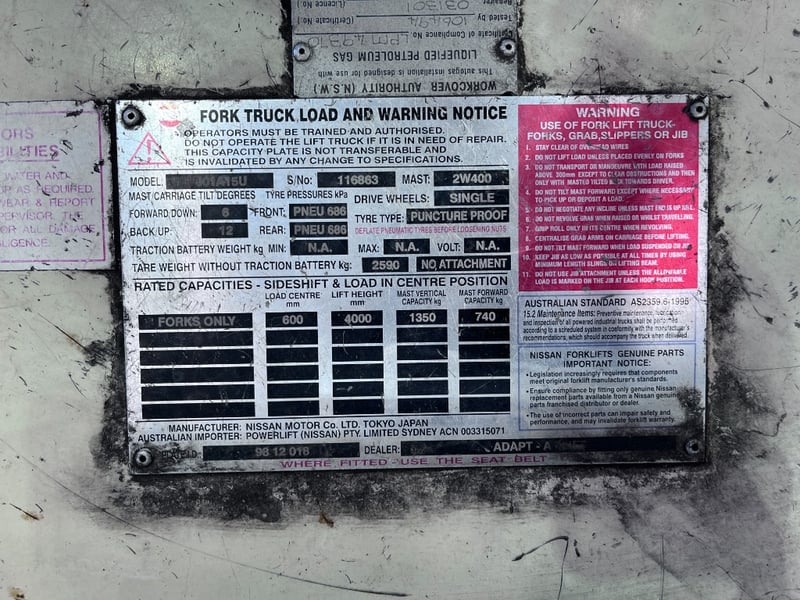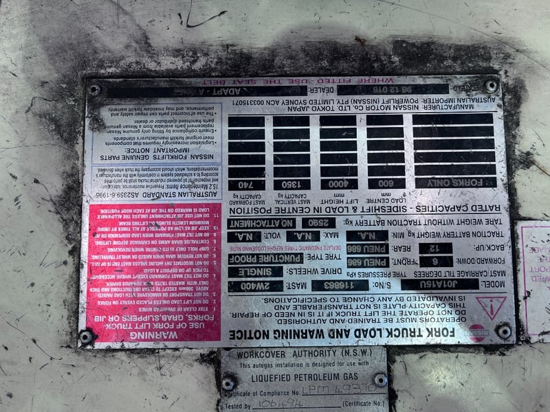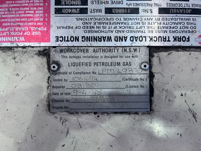 2000 Nissan J01A15U 1.5T Counter Balance Forklift. Year: 2000Make: Nissan Model: J01A15UBody: Forklift Hours Indicated: 2331.3hSerial Num: 116863Tare: 2590kgsFuel: Petrol/LPG Description:- Leather Seats - Up/down - Forward/Back Tilt - Top Mount Lights - Rear Beacon CHASSIS: J01116863Enquiry: Jonathan N | 0400 733 207 | [email protected] Location: Silverwater, Sydney NSW