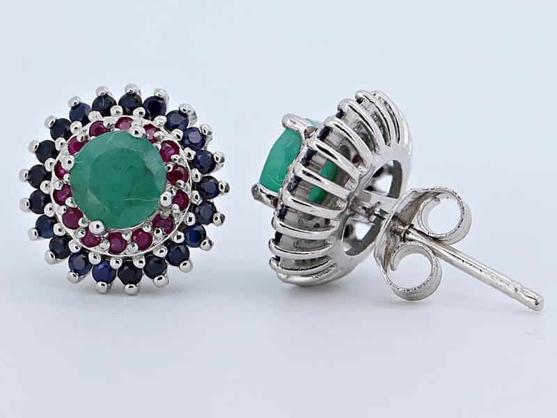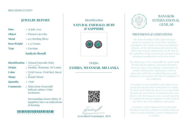 NATURAL EMERALD, RUBY SRI LANKAN SAPPHIRE (UNTREATED) EARRINGS ON 925 SILVER - WITH CERTIFICATE Gemstone : Natural Emerald, Ruby Sri Lankan Sapphire (Untreated)Certificate Number : Bigl20240122132873Item Total Weight : 2.73 GramsMain Stone Color : Vivid Green, Vivid Red, Royal BlueSize : Comments : Main Stone (Emerald) Indicate Minor Cedar Treatment.Surrounding Stones (Ruby Sri Lankan Sapphire (Untreated)) Have No Indications Of Heating. ✻ Verify Report Online At Www.Bangkokinternationalgemlab.Co 0+27