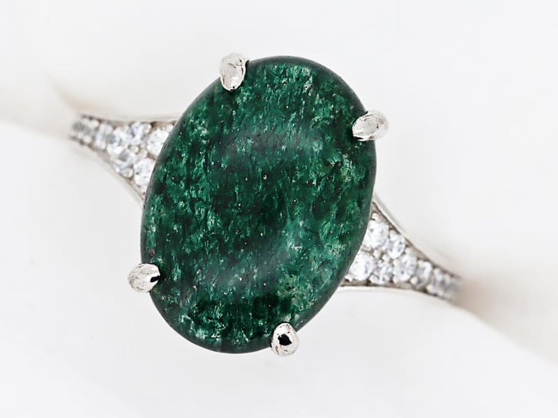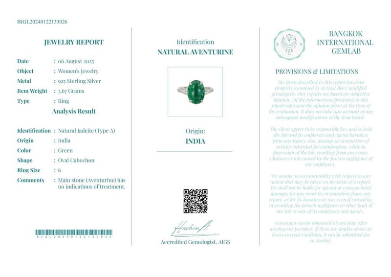 NATURAL AVENTURINE RING ON 925 SILVER - WITH CERTIFICATE Gemstone : Natural AventurineCertificate Number : Bigl20240122133026Item Total Weight : 3.67 GramsMain Stone Color : GreenSize : 6Comments : Main Stone (Aventurine) Has No Indications Of Treatment. ✻ Verify Report Online At Www.Bangkokinternationalgemlab.Co 0+37