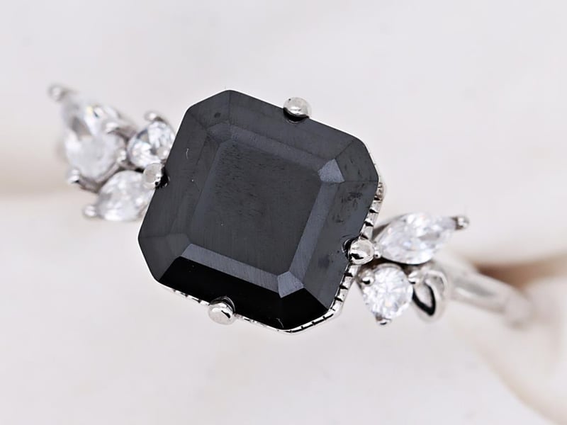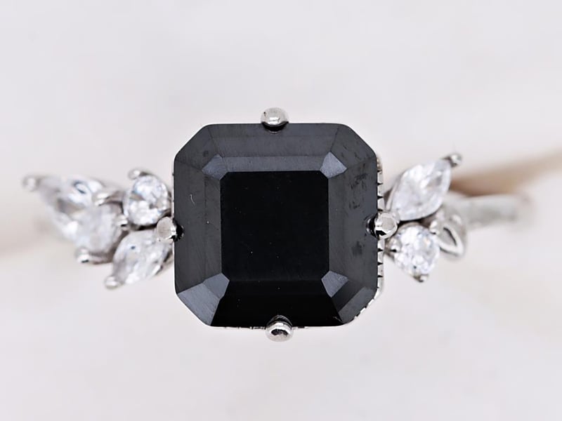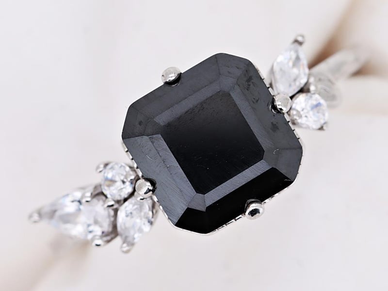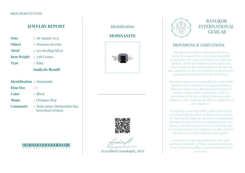 MOISSANITE RING ON 925 SILVER - WITH CERTIFICATE Gemstone : MoissaniteCertificate Number : Bigl20240122133103Item Total Weight : 2.68 GramsMain Stone Color : BlackSize : 7Comments : Main Stone (Moissanite) Has Been Heat Treated. ✻ Verify Report Online At Www.Bangkokinternationalgemlab.Co 0+42