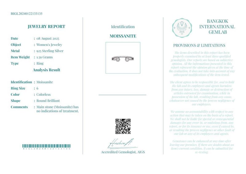 MOISSANITE RING ON 925 SILVER - WITH CERTIFICATE Gemstone : MoissaniteCertificate Number : Bigl20240122133135Item Total Weight : 1.59 GramsMain Stone Color : ColorlessSize : 6Comments : Main Stone (Moissanite) Has No Indications Of Treatment. ✻ Verify Report Online At Www.Bangkokinternationalgemlab.Co 0+44