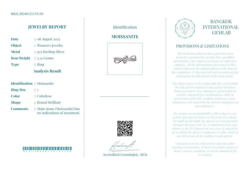 MOISSANITE RING ON 925 SILVER - WITH CERTIFICATE Gemstone : MoissaniteCertificate Number : Bigl20240122133150Item Total Weight : 2.31 GramsMain Stone Color : ColorlessSize : 7Comments : Main Stone (Moissanite) Has No Indications Of Treatment. ✻ Verify Report Online At Www.Bangkokinternationalgemlab.Co 0+45
