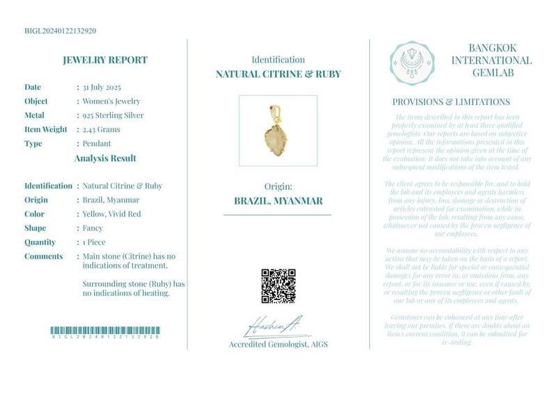 NATURAL CITRINE & BURMESE RUBY (UNHEATED) PENDANT ON 925 SILVER - WITH CERTIFICATE Gemstone : Natural Citrine & Burmese Ruby (Unheated)Certificate Number : Bigl20240122132920Item Total Weight : 2.43 GramsMain Stone Color : Yellow, Vivid RedSize : Comments : Main Stone (Citrine) Has No Indications Of Treatment.Surrounding Stone (Ruby) Has No Indications Of Heating. ✻ Verify Report Online At Www.Bangkokinternationalgemlab.Co 0+30