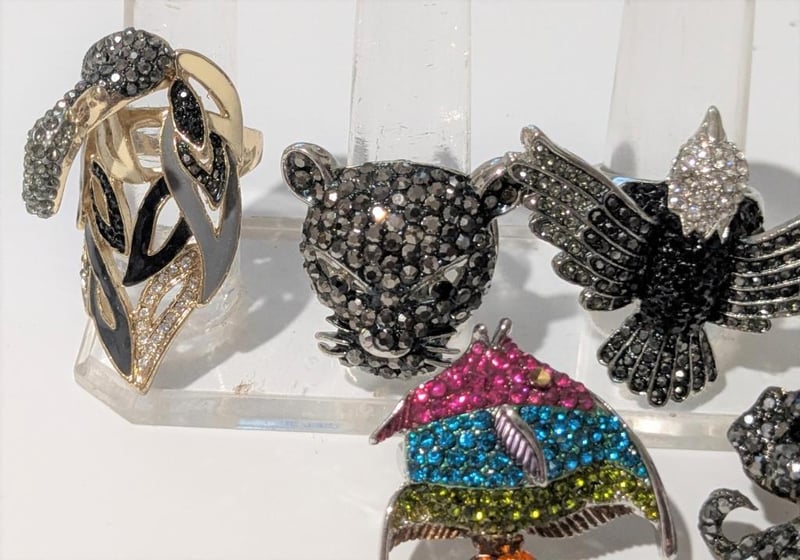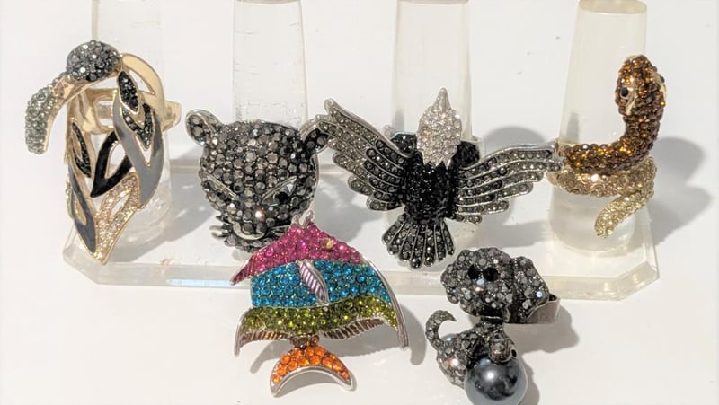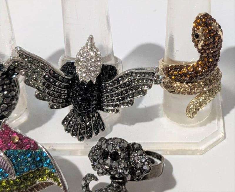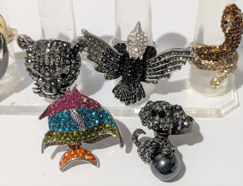 FIGURAL LARGE STATEMENT RHINESTONE RINGS Incl Bird, Snake, Poodle, Fish, Swan & LeopardCondition: Good - Refer To Images+7