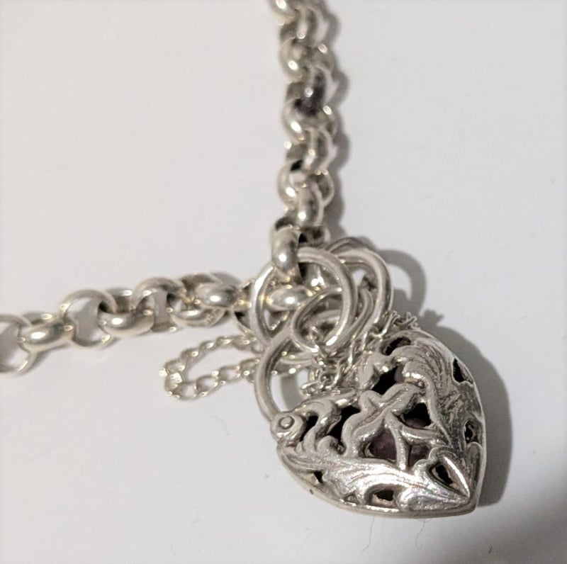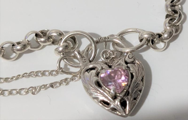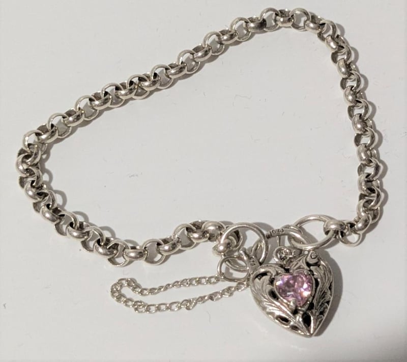 STERLING SILVER PADLOCK BRACELET WITH PINK STONE & SAFETY CHAIN