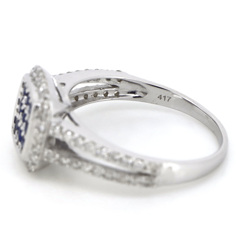10K WHITE GOLD, BLUE SAPPHIRE AND DIAMOND, DECORATIVE SPLIT BAND RING. The Central Design Features, 9 Round Cut, Medium-Dark Royal-Blue, Sapphires (0.24Ct Tsw, Eye Clean Clarity), Shared Claw Set. Surrounding The Centre In A Halo And Decorating The Band Are, 60 Round Brilliant Cut, Diamonds (0.43Ct Tdw, H-J Colour, Si2-I2 Clarity), Shared Claw Set. Ring Size N. 10K White Gold, Blue Sapphire And Diamond, Decorative Split Band Ring. The Central Design Features, 9 Round Cut, Medium-Dark Royal-Blue, Sapphires (0.24Ct Tsw, Eye Clean Clarity), Shared Claw Set. Surrounding The Centre In A Halo And Decorating The Band Are, 60 Round Brilliant Cut, Diamonds (0.43Ct Tdw, H-J Colour, Si2-I2 Clarity), Shared Claw Set. Ring Size N. Jewellery Valuations Provided By A Third Party Professional Not Directly Associated With Lloyds Auctions at AUD $4,520.00This Insurance Valuation has been provided by a registered Jewellery Valuer and is intended for insurance purposes only. The valuation amount has no bearing on the auction value of the item. Any questions regarding the valuation should be directed to the issuing Valuer (refer to contact details on the certificate) as Lloyds have no association or relationship with the Valuer or the valuation amount contained within the valuation. Condition: NEW 0584876+1498