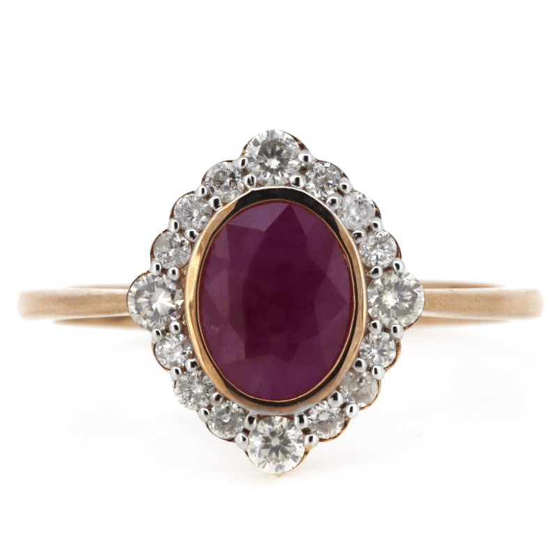 14K Rose Gold, Ruby And Diamond, Dress Ring. The Centre Features, One Oval Cut, Purplish-Red Colour, Ruby (1.16Ct, Clarity-Included), Bezel Set. Surrounding The Centre In A Halo Are, 16 Round Brilliant Cut, Diamonds (0.35Ct Tdw, H-J Colour, Si2-I2 Clarity), Claw Set. Ring Size P.