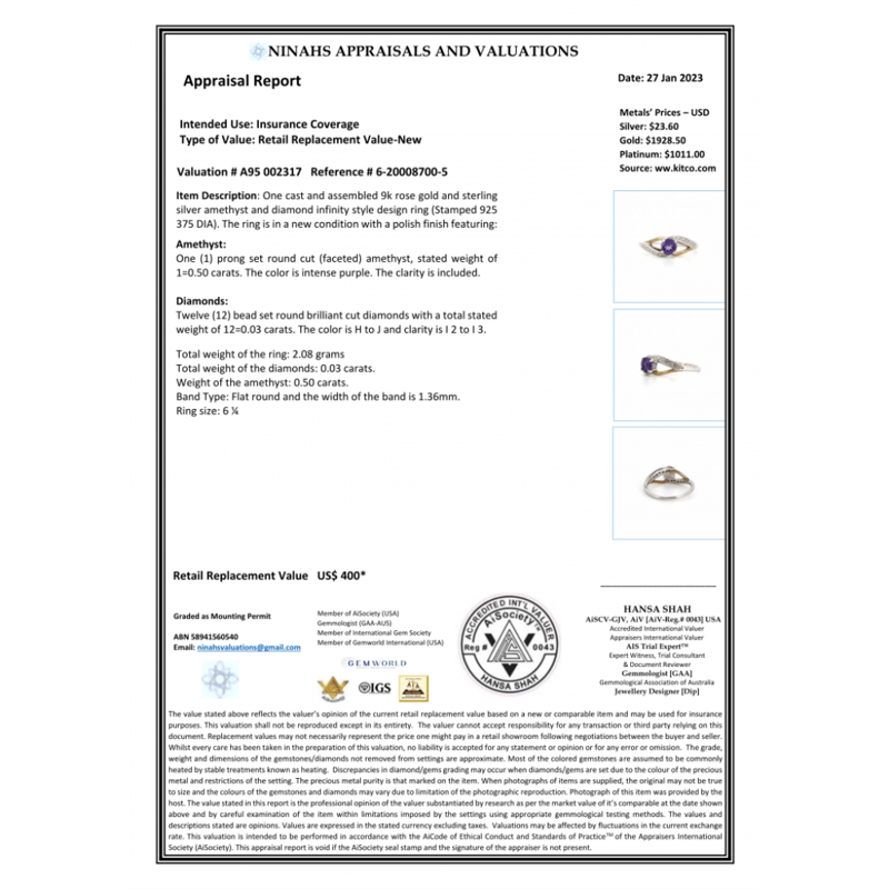 This Insurance Valuation has been provided by a registered Jewellery Valuer and is intended for insurance purposes only. The valuation amount has no bearing on the auction value of the item. Any questions regarding the valuation should be directed to the issuing Valuer (refer to contact details on the certificate) as Lloyds have no association or relationship with the Valuer or the valuation amount contained within the valuation.