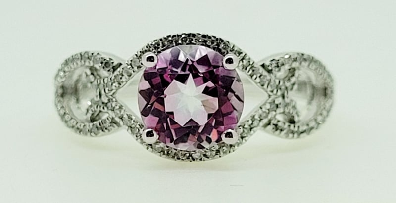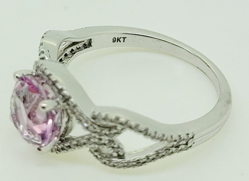 9 CT WHITE GOLD NATURAL DIAMOND & PINK TOPAZ RING1 Pink Topaz = 1.63 Carat88 Round Brilliant Diamonds = 0.15 CaratRing Weight: 3.02 GramsCondition: Good - Refer To Images488971+47
