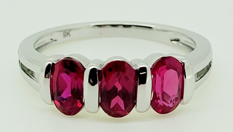 9 CT WHITE GOLD NATURAL CREATED RUBY RING3 Ruby = 1.60 CaratRing Weight: 2.60 GramsCondition: Good - Refer To Images488971+50