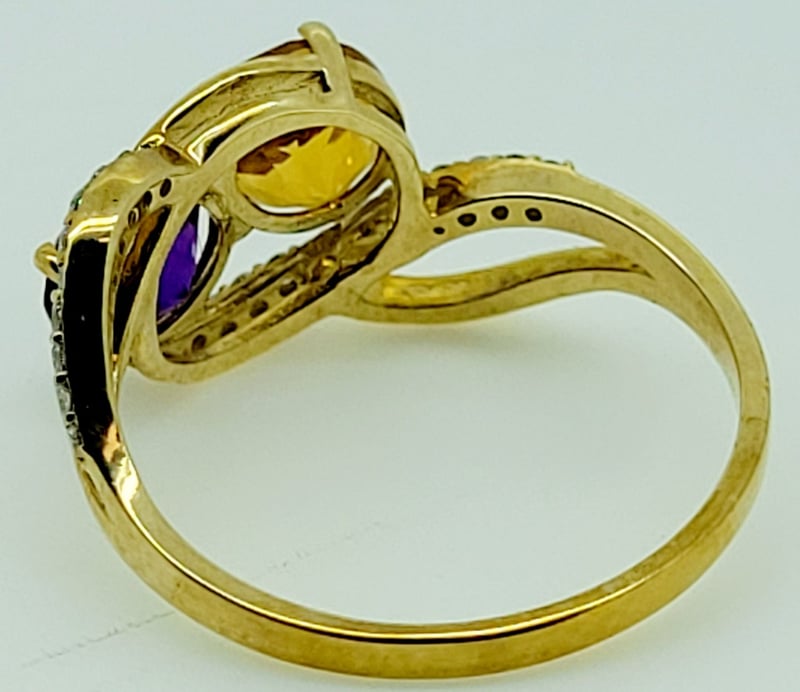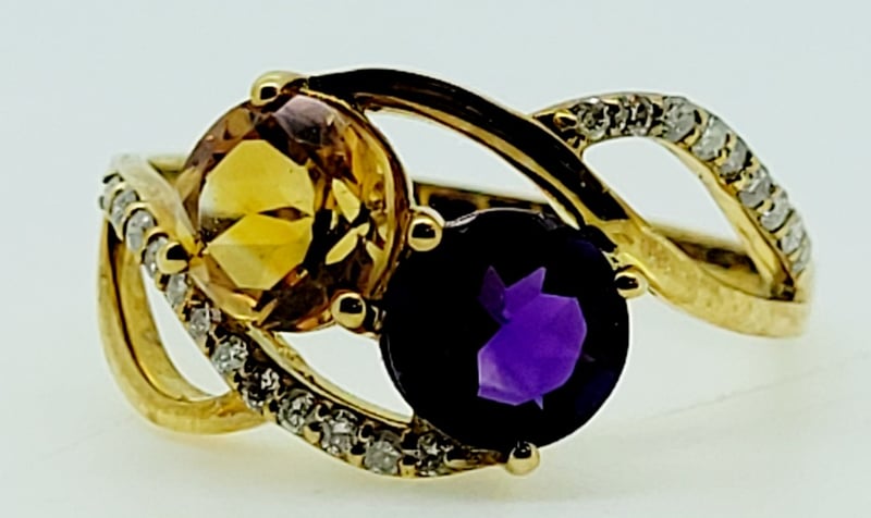 10 CT YELLOW GOLD NATURAL DIAMOND , CITRINE AND AMETHYST RING1 Citrine = 0.87 Carat , 1 Amethyst = 0.73 Carat21 Round Brilliant Diamonds = 0.12 CaratRing Weight: 2.05 GramsCondition: Good - Refer To Images488971+16