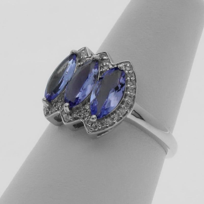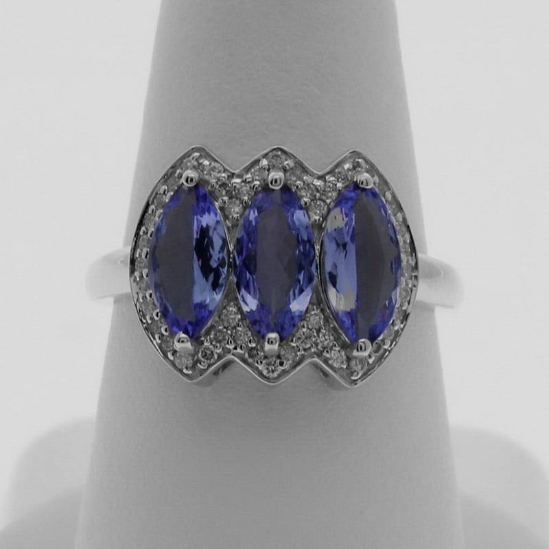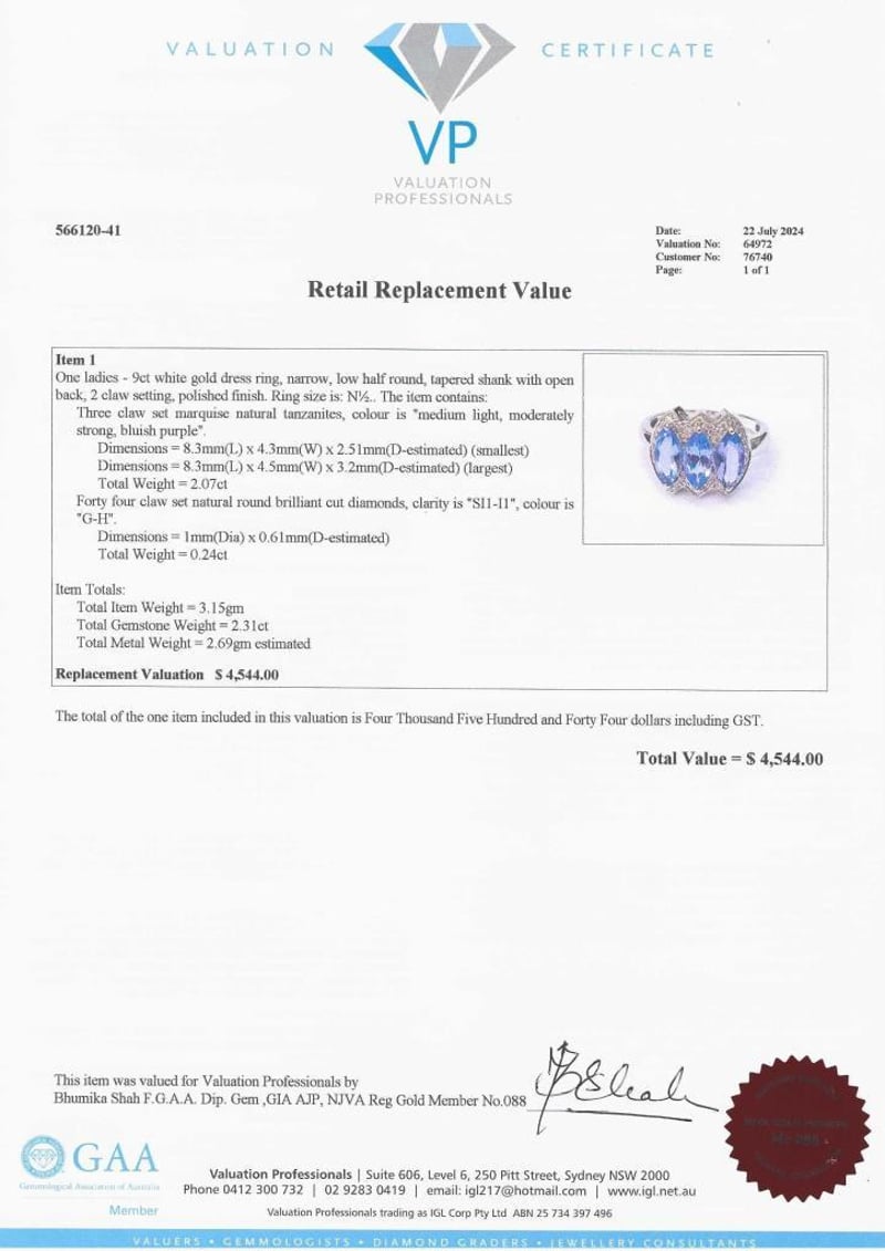 9CT WHITE GOLD DRESS RING One Ladies - 9Ct White Gold Dress Ring, Narrow, Low Half Round, Tapered Shank With Open Back, 2 Claw Setting, Polished Finish. Ring Size Is: N½.. The Item Contains: Three Claw Set Marquise Natural Tanzanites, Colour Is "Medium Light, Moderately Strong, Bluish Purple". Dimensions = 8.3Mm(L) X 4.3Mm(W) X 2.51Mm(D-Estimated) (Smallest) Dimensions = 8.3Mm(L) X 4.5Mm(W) X 3.2Mm(D-Estimated) (Largest) Total Weight = 2.07Ct Forty Four Claw Set Natural Round Brilliant Cut Diamonds, Clarity Is "Si1-I1", Colour Is "G-H". Dimensions = 1Mm(Dia) X 0.61Mm(D-Estimated) Total Weight = 0.24CtItem Totals: Total Item Weight = 3.15Gm Total Gemstone Weight = 2.31Ct Total Metal Weight = 2.69Gm Estimated Valuations Provided by an Independent Third-Party Professional Not Directly Associated With Lloyds Auctions at AUD $4544This valuation has been conducted by an independent third-party professional. The valuation amount is an assessment by the issuing valuer and does not reflect the auction value of the item. Any inquiries regarding the valuation should be directed to the issuing valuer (refer to contact details on the certificate), as Lloyds Auctions has no affiliation or influence over the valuation, the valuer, or the stated amount. Condition: Good - Refer Images 0488972+9