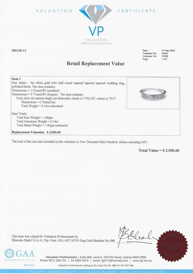 9CT WHITE GOLD LOLW HALF ROUND TAPERED WEDDING RING One Ladies - 9Ct White Gold Lolw Half Round Tapered Tapered Tapered Wedding Ring, Polished Finish. The Item Contains:Dimensions = 1.91Mm(W) (Smallest)Dimensions = 3.77Mm(W) (Largest). The Item Contains: Forty Claw Set Natural Single Cut Diamonds, Clarity Is "Vs2-Si", Colour Is "H-I". Dimensions = 0.7Mm(Dia) Total Weight = 0.14Ct CalculatedItem Totals: Total Item Weight = 1.88Gm Total Gemstone Weight = 0.14Ct Total Metal Weight = 1.85Gm Estimated Valuations Provided by an Independent Third-Party Professional Not Directly Associated With Lloyds Auctions at AUD $2900This valuation has been conducted by an independent third-party professional. The valuation amount is an assessment by the issuing valuer and does not reflect the auction value of the item. Any inquiries regarding the valuation should be directed to the issuing valuer (refer to contact details on the certificate), as Lloyds Auctions has no affiliation or influence over the valuation, the valuer, or the stated amount. Condition: Good - Refer Images 0488972+8