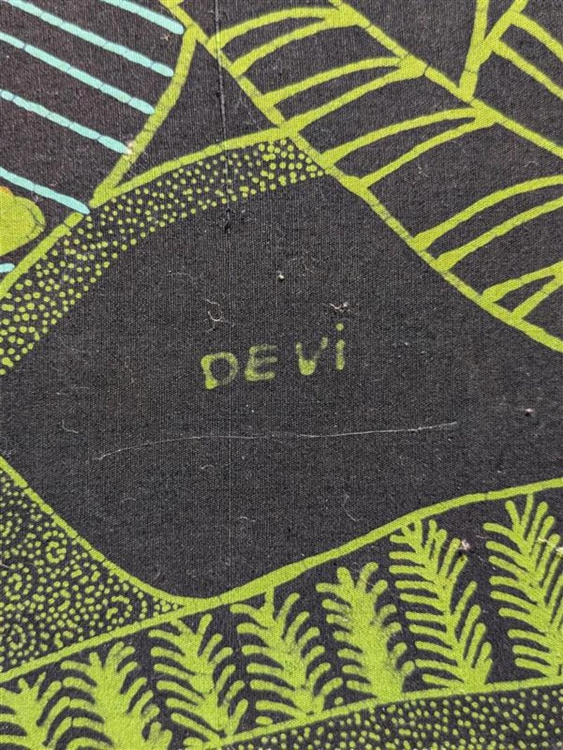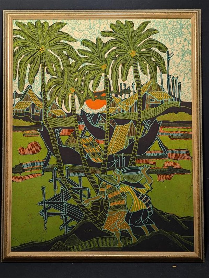 DEVI Batik On Fabric Title: Untitled Image Size: 88cm x 68cm Item Size: Height: 96cm, Width: 77cm, Depth: 3cm, Weight: 2Kg Signature Details: Signed Devi Middle Bottom Condition: Fair - Refer To Images Sr 233442+9