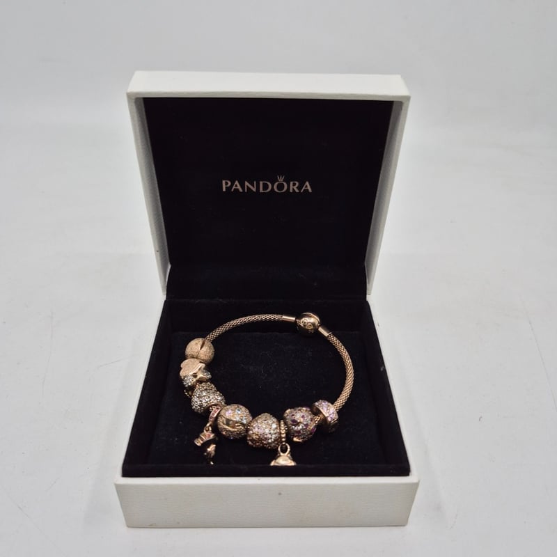 Authentic Pandora Rose Gold-Plated Mesh Bracelet Featuring Charm Collection.