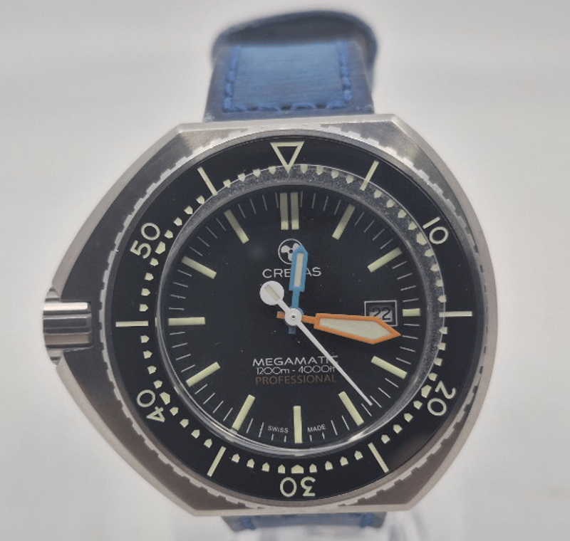 CREPAS MEGAMATIC Price Guide - $2,000 - Circa Movement: Automatic Case material: Steel Bracelet material: Steel Year of production: Unknown Scope of delivery: Original box, original papers Condition: Good - Refer To Images Additional Information: L.E: 389/500, With Watch Roll 586174+2