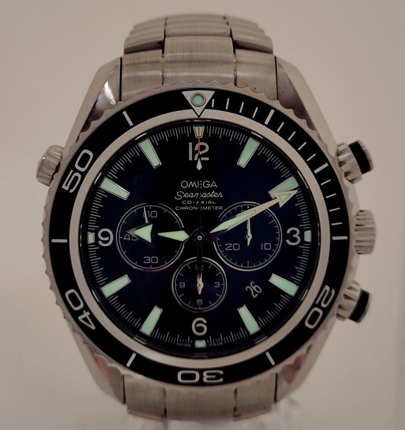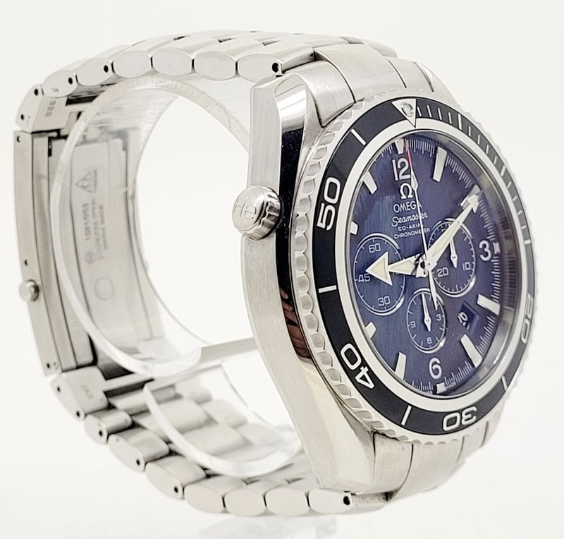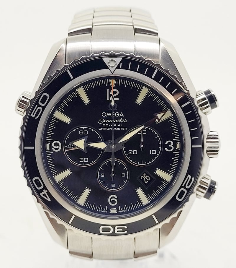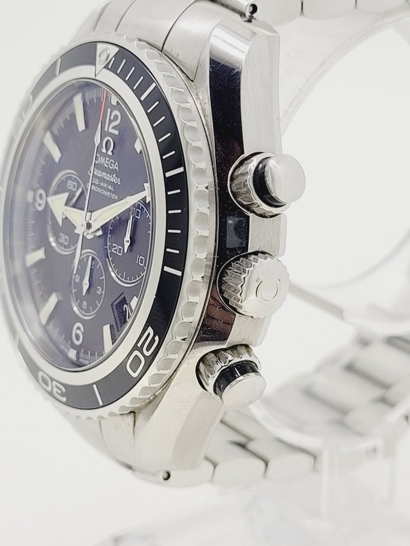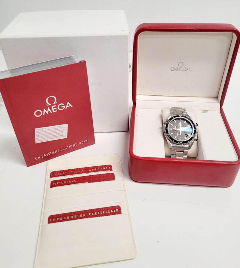 OMEGA SEAMASTER PLANET OCEAN CHRONOGRAPH 2009 PRODUCTION YEAR: 2009DIAL: BLACK DIALCASE DESCRIPTION: STAINLESS STEELCASE SIZE: 45MMBRACELET: STAINLESS STEELBOX: INCLUDEDPAPERS: INCLUDEDCondition: Good - Refer To Images488367+2