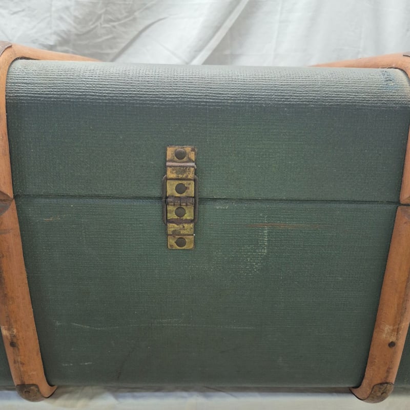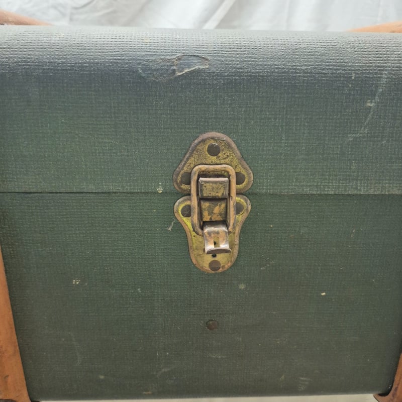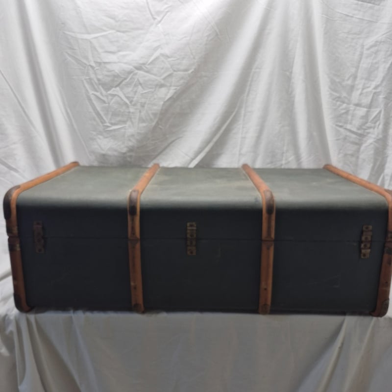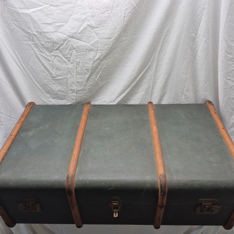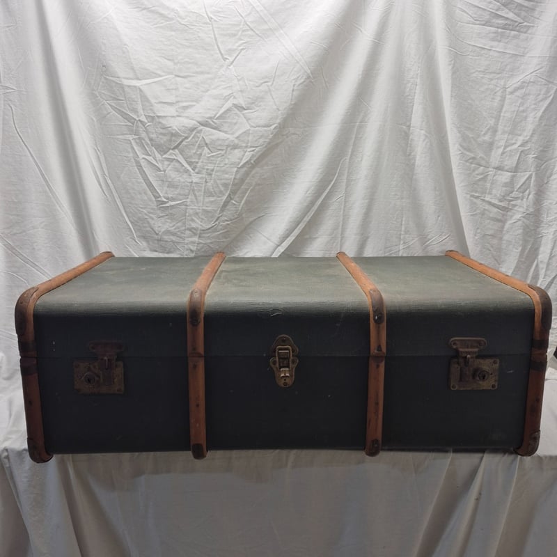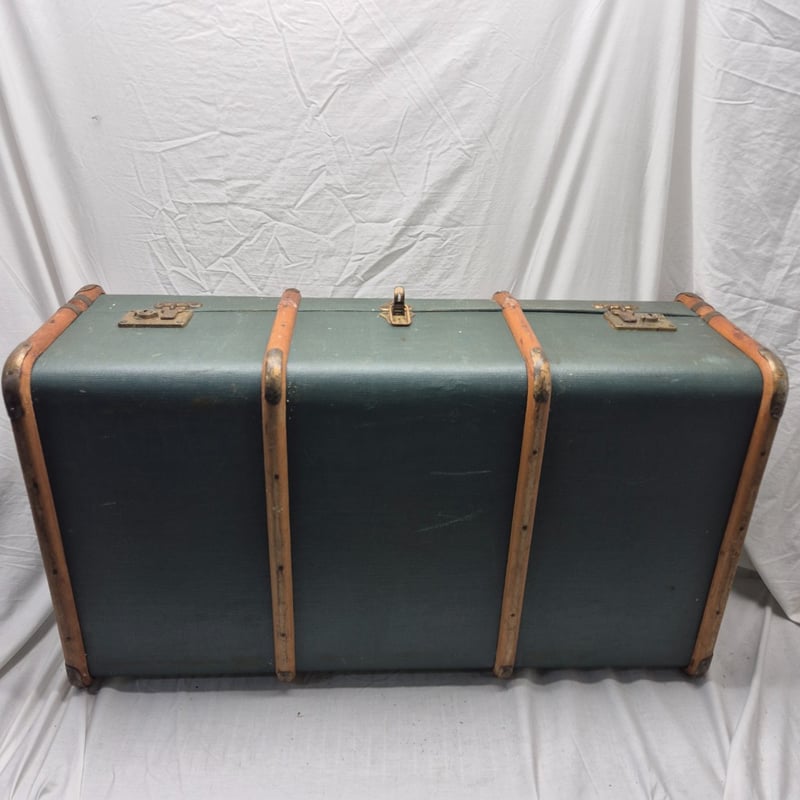 VINTAGE STEAMER TRUNK WITH CANVAS AND LEATHER BINDING LOCKEDItem Size: Height: 32cm, Width: 92cm, Depth: 52cmEarly 20Th Century Steamer Trunk Featuring Forest Green Canvas Exterior With Natural Wood Slats And Brass Hardware. Constructed With Wooden Frame And Reinforced Leather Strapping Across Three Bands. Features Dual Brass Latches, Brass Corner Protectors, And Curved Wooden Handles At Either End. Interior Lined With Aged Fabric. Multiple Carrying Handles Mounted On Sides.Condition: Good - Refer To Images9D587713+3