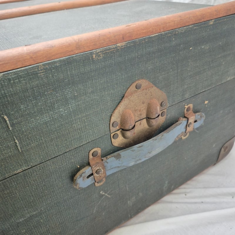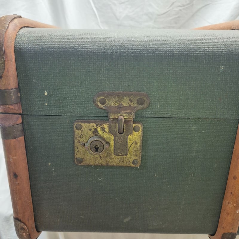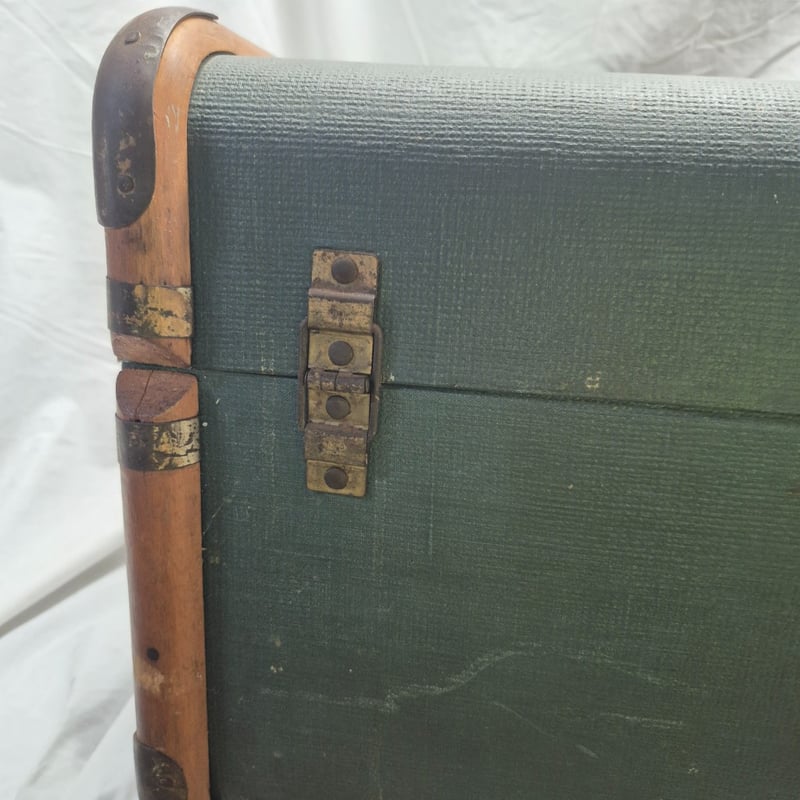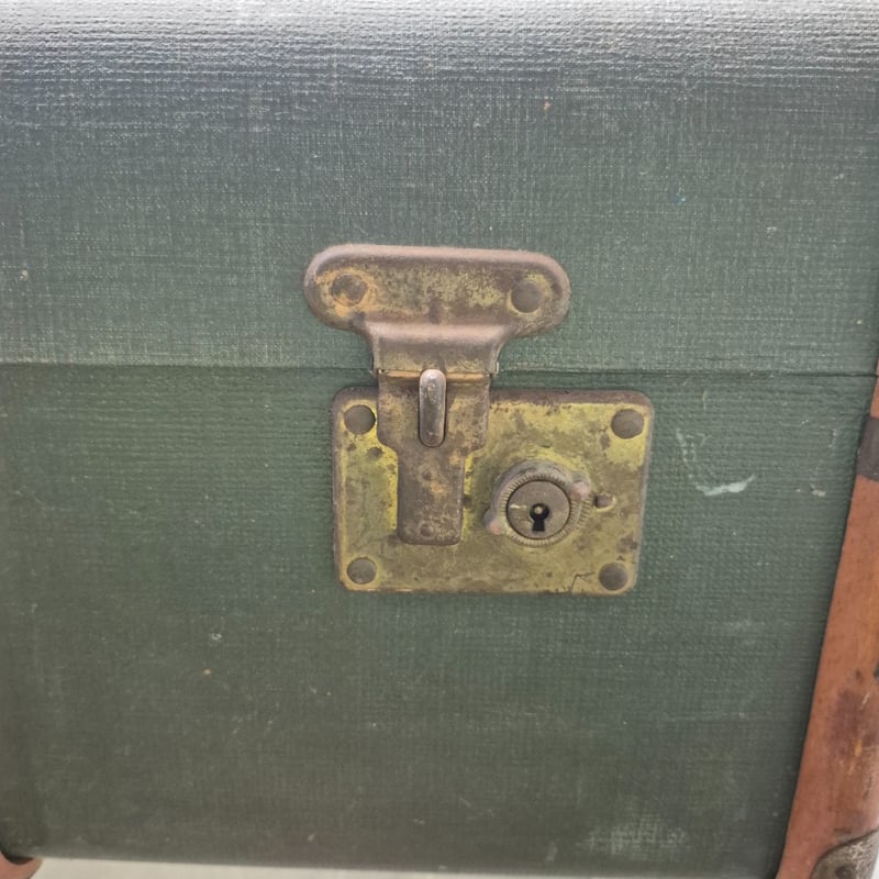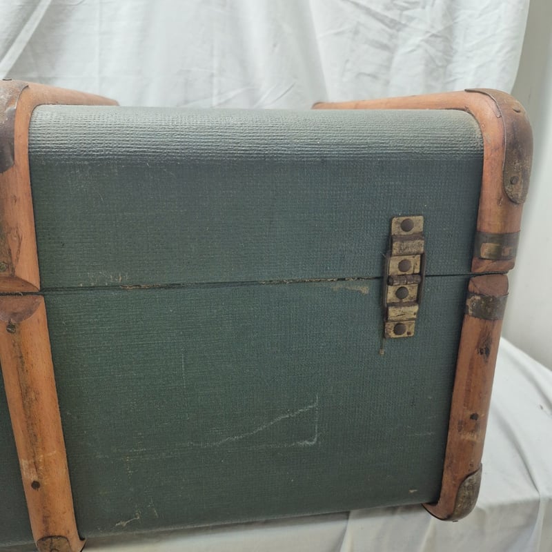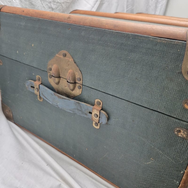 VINTAGE STEAMER TRUNK WITH CANVAS AND LEATHER BINDING LOCKEDItem Size: Height: 32cm, Width: 92cm, Depth: 52cmEarly 20Th Century Steamer Trunk Featuring Forest Green Canvas Exterior With Natural Wood Slats And Brass Hardware. Constructed With Wooden Frame And Reinforced Leather Strapping Across Three Bands. Features Dual Brass Latches, Brass Corner Protectors, And Curved Wooden Handles At Either End. Interior Lined With Aged Fabric. Multiple Carrying Handles Mounted On Sides.Condition: Good - Refer To Images9D587713+3