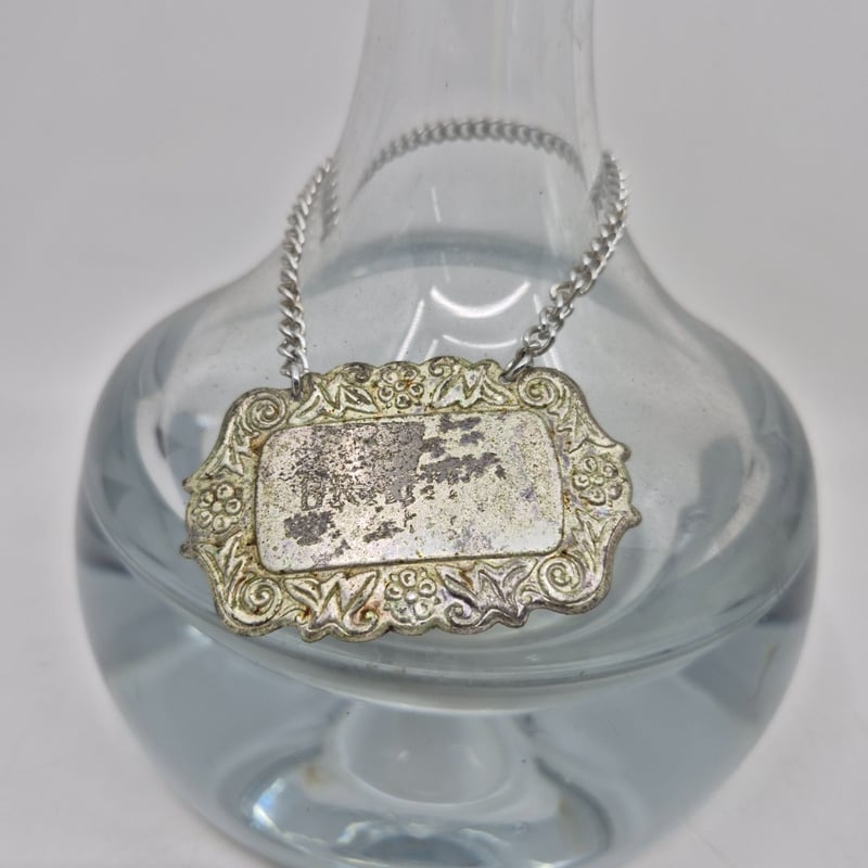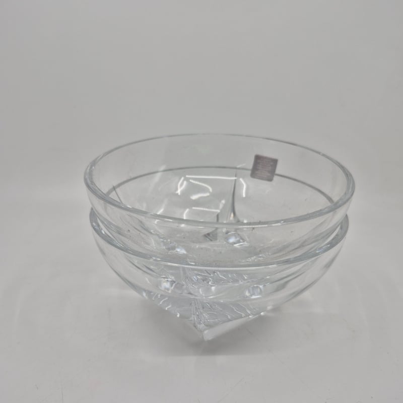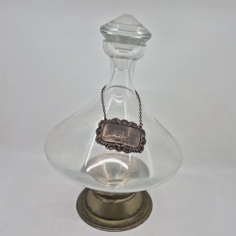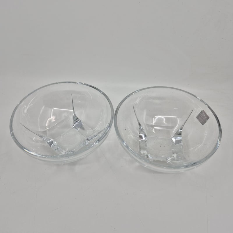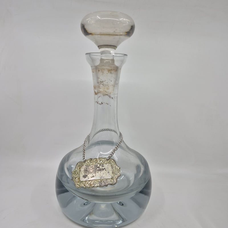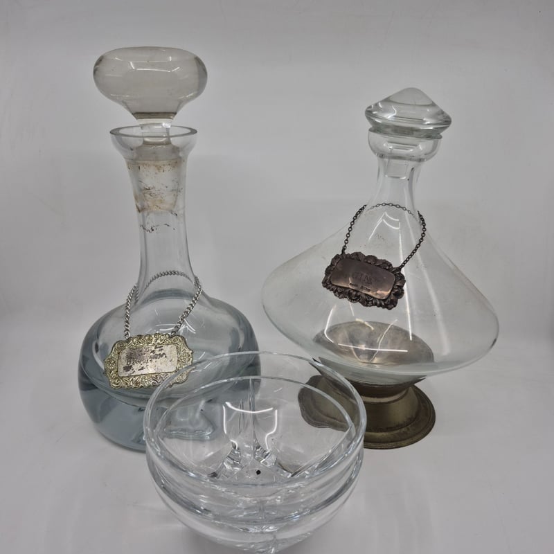 Fine Glass Decanter Set Comprising With Decorative Glass Stoppers. The Set Includes Two Decanters With Solid Glass Stoppers And Matching Silver Label Tags. Two Glass Bowls With Geometric Cut Patterns Complete The Ensemble.