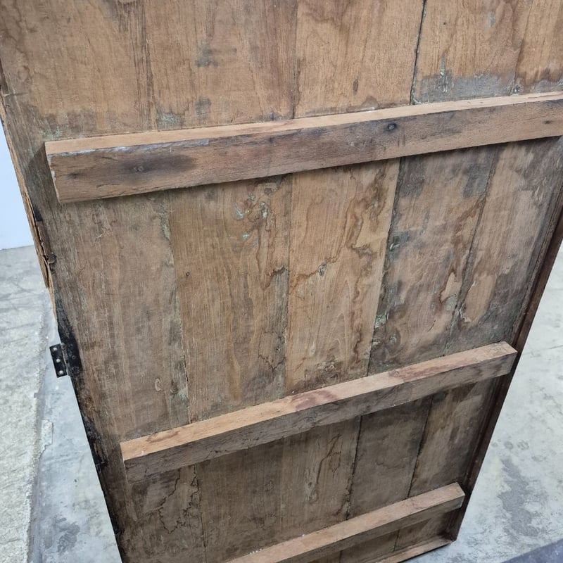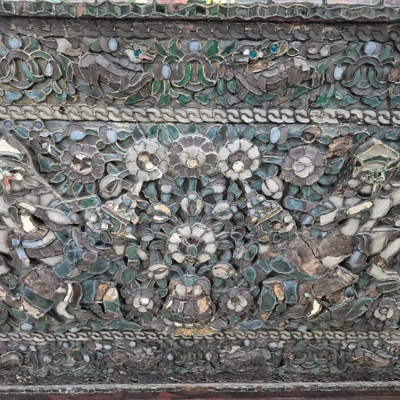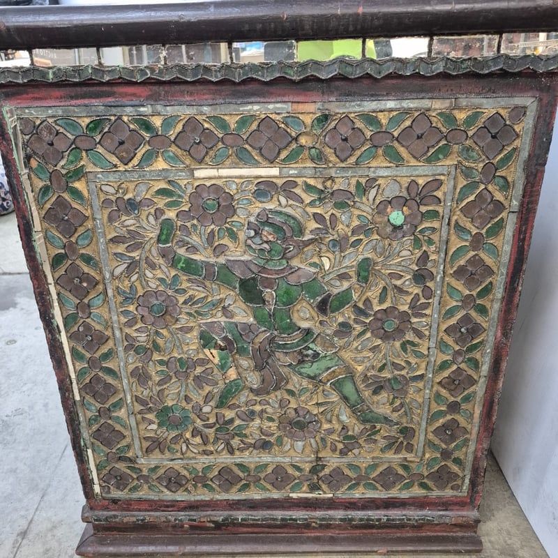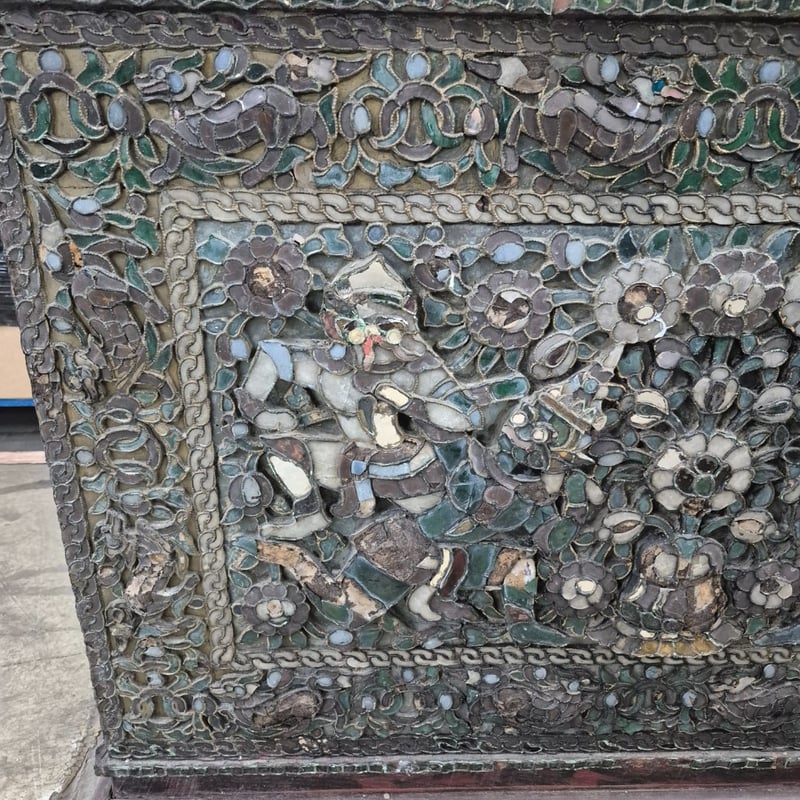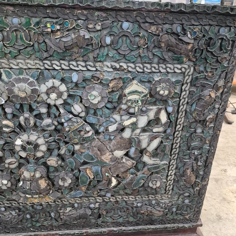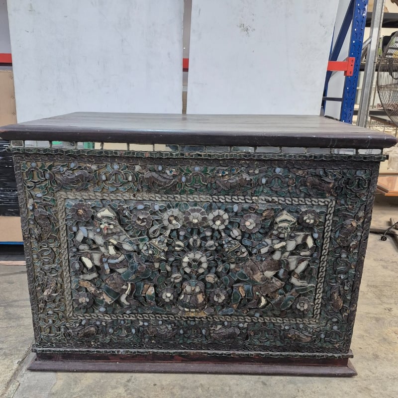 ANTIQUE CARVED HARDWOOD CABINET WITH SHELL AND STONE INLAY