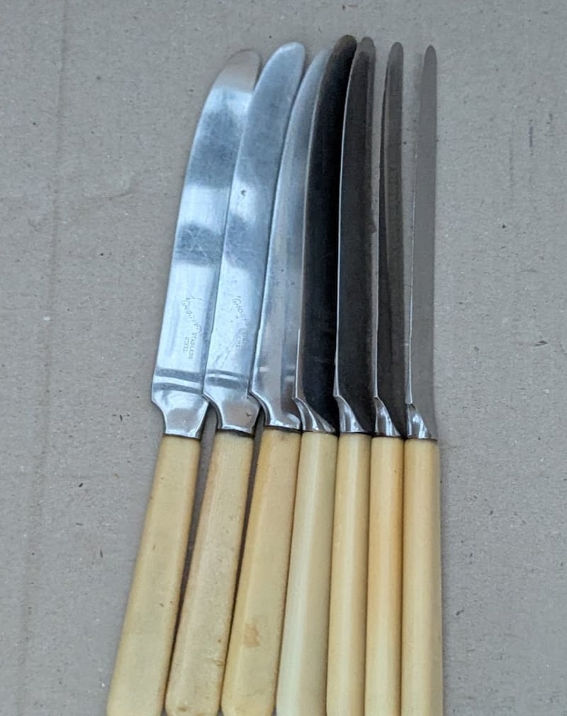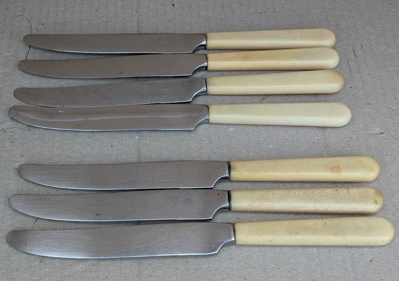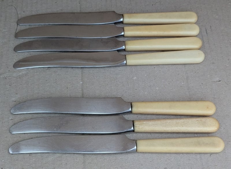 VINTAGE STAINLESS STEEL BUTTER KNIVES BONE HANDLE PHOENIX IMPERIAL AND GROSVENORItem Size: Height: 6cm, Width: 6cm, Depth: 20cm, Weight: 0.5KgQty 7Condition: Good - Refer To Images11D586809+10