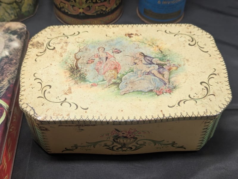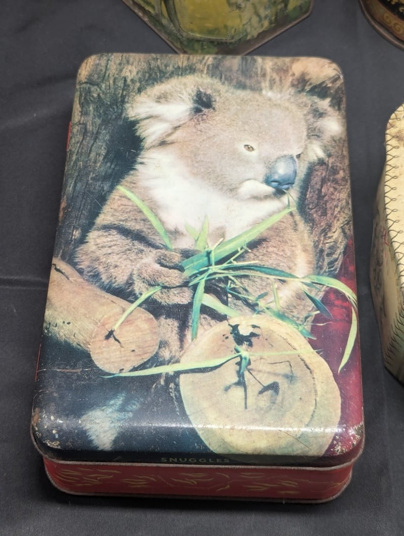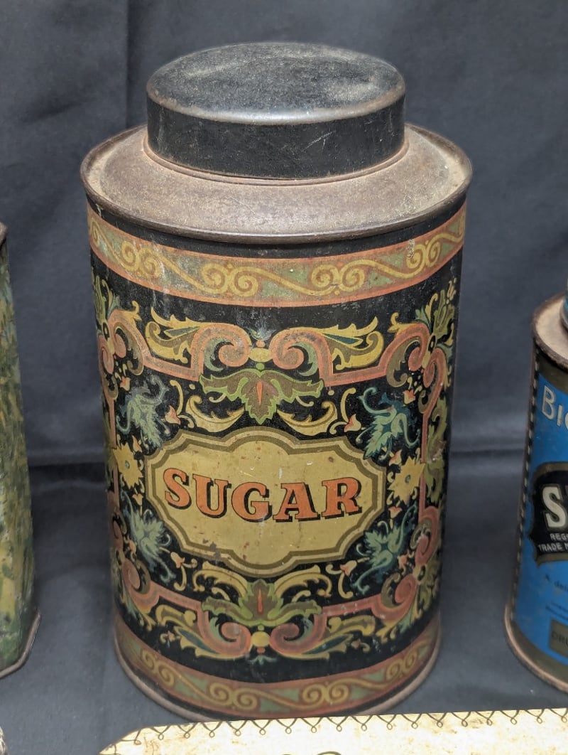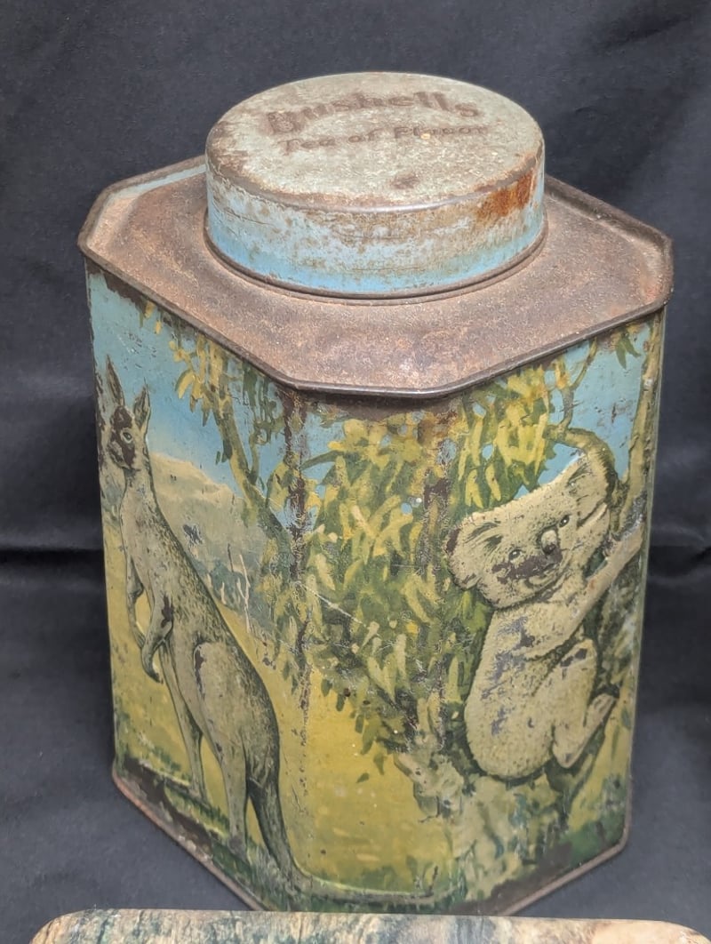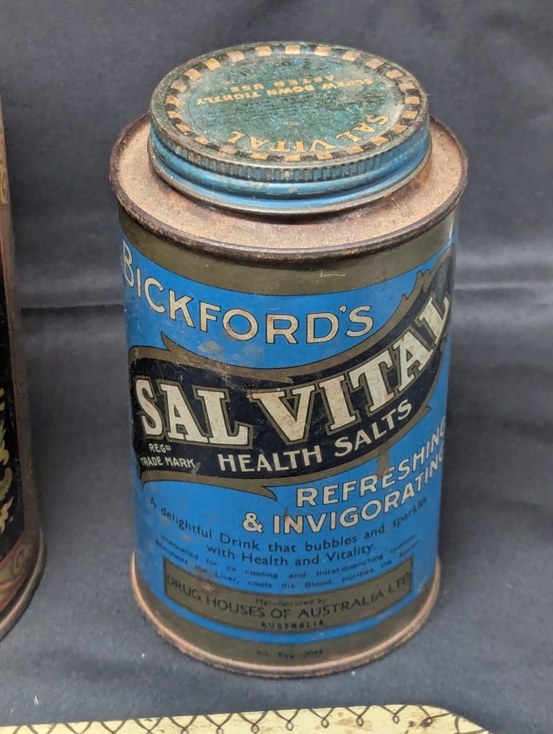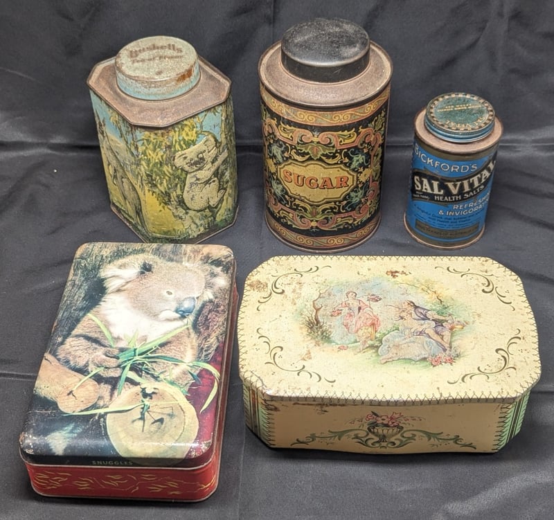 Two Tins Feature Australian Wildlife Imagery, One 'Sugar Tin, One Tin Features Image Of People In Nature With Floral Style Imagery Around Exterior, 'Bickfords Sal Vital Health Salts' Tin