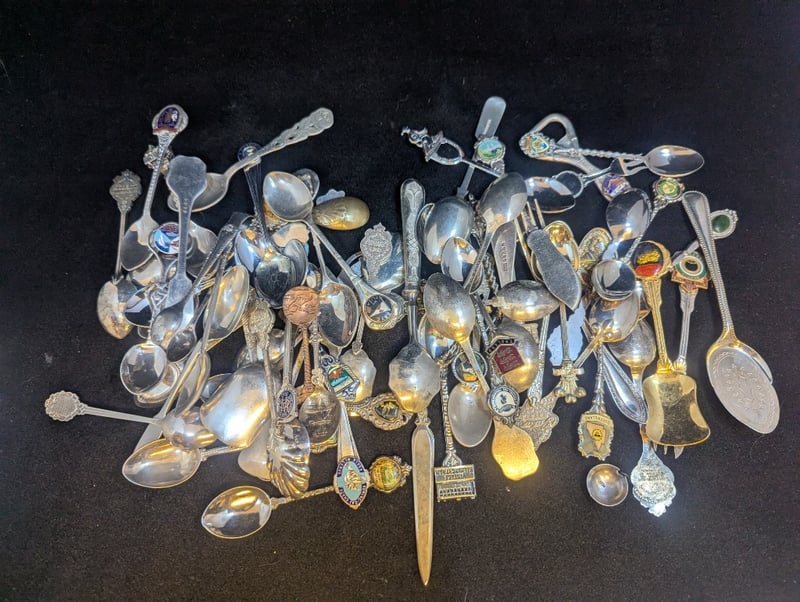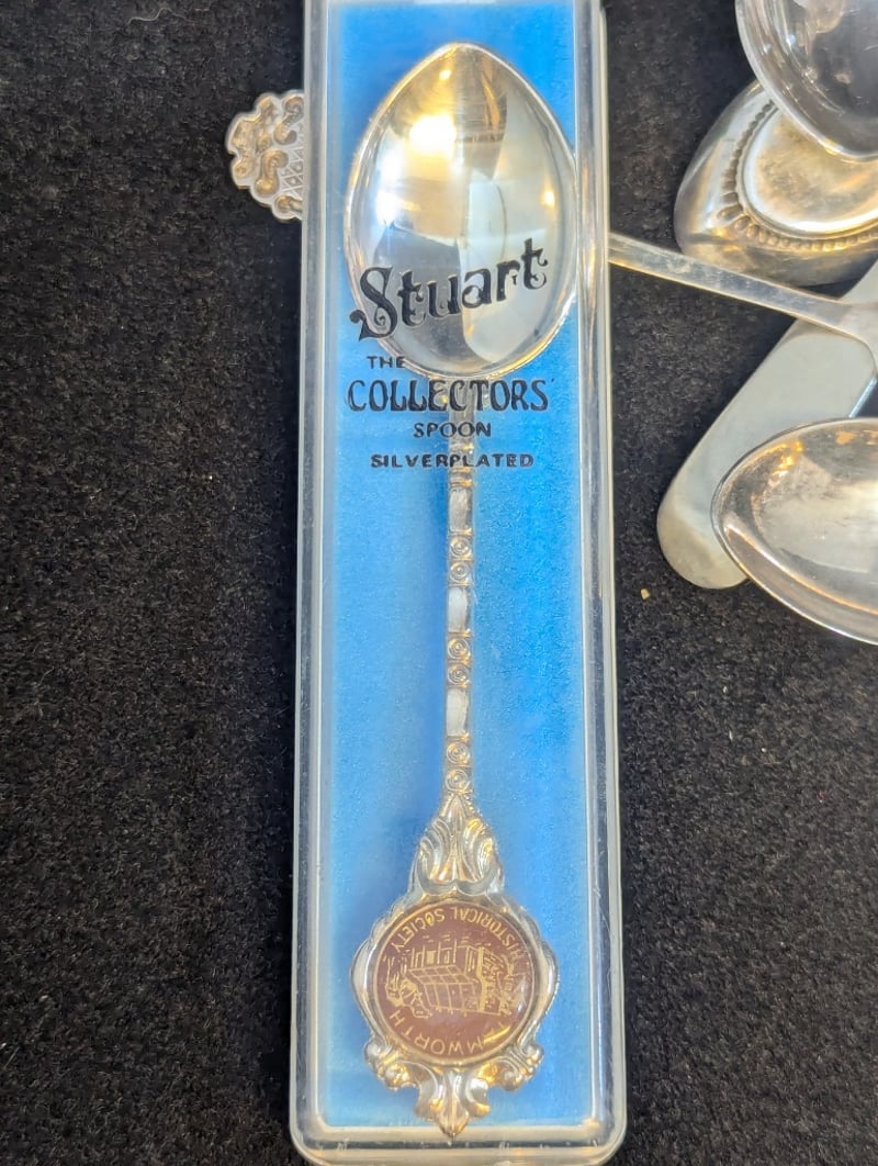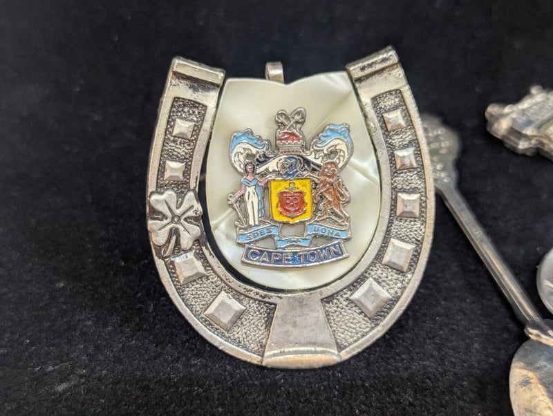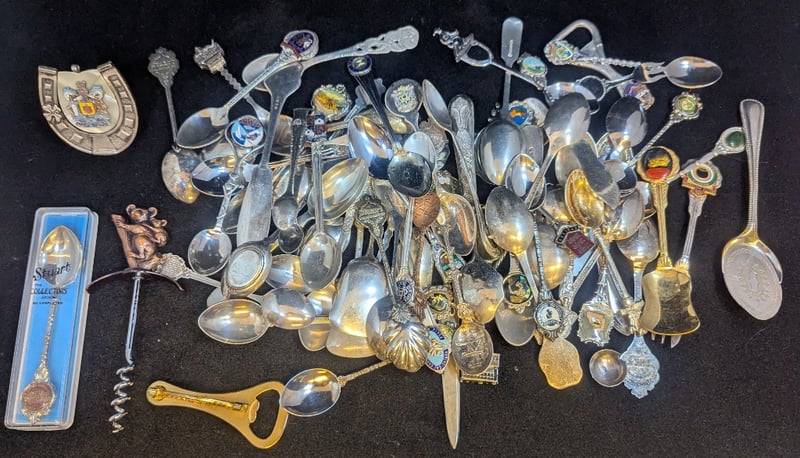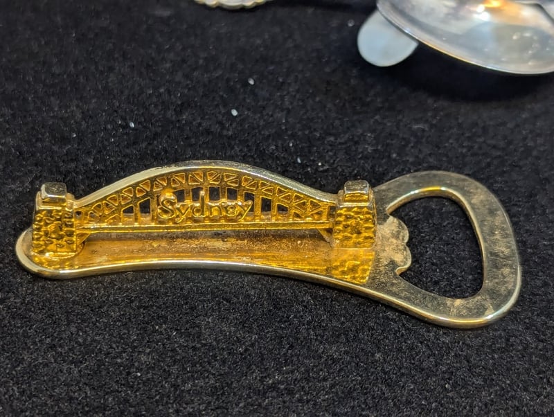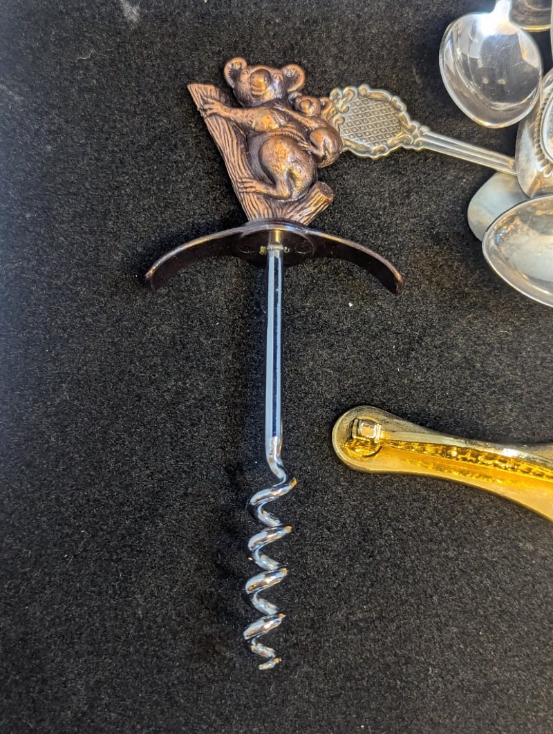 ASSORTED COLLECTOR SPOONS, BOTTLE OPENER AND METAL DISPLAY BADGE