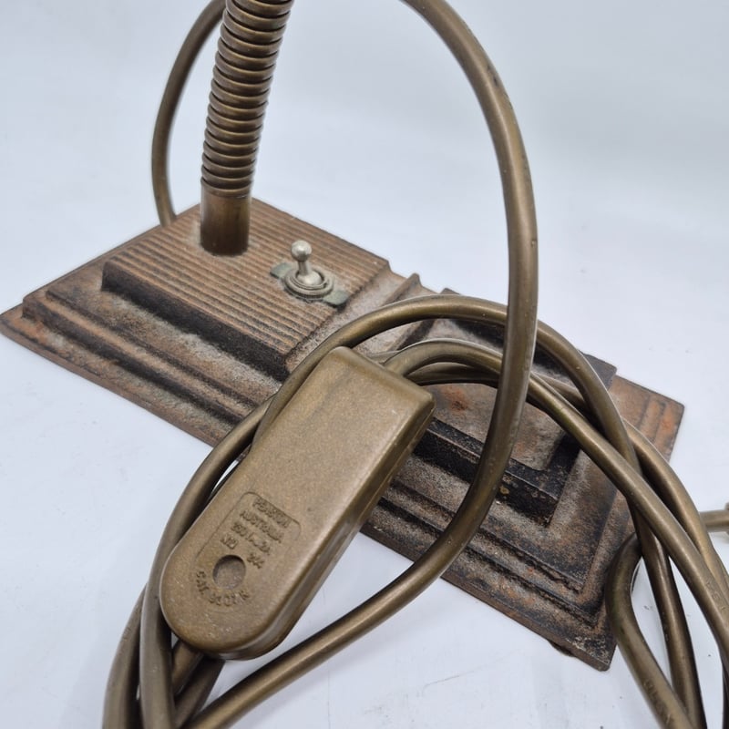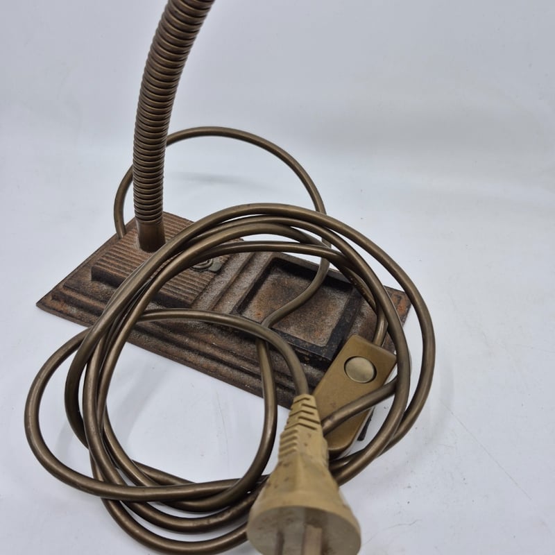 Brass Desk Lamp Featuring An Adjustable Gooseneck Arm With Ribbed Detailing,