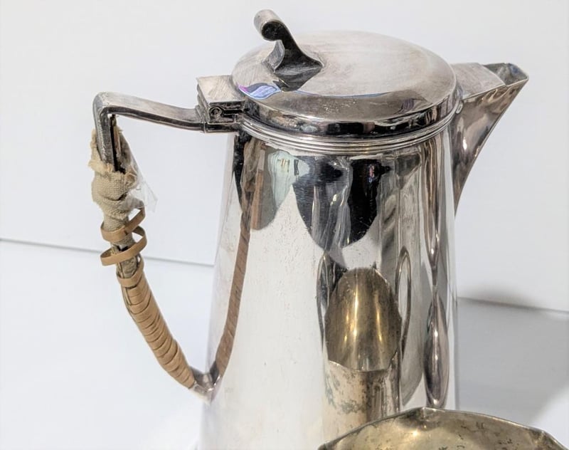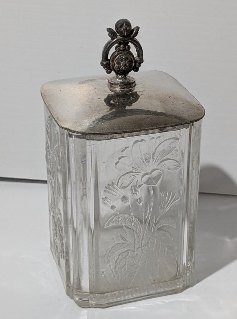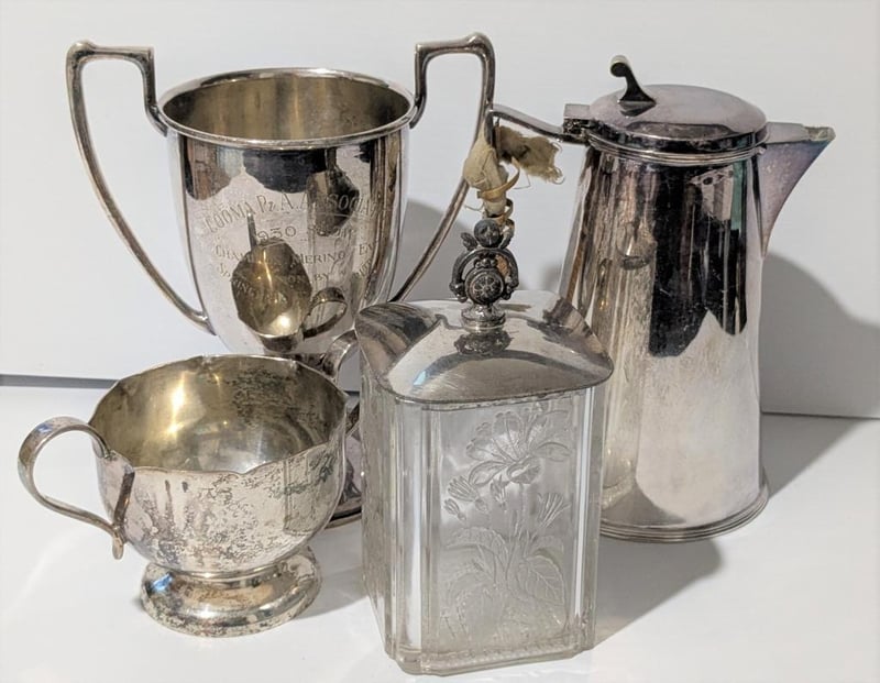 ASSORTED SILVER PLATED CUPS, JUG & GLASS LIDDED CONTAINER