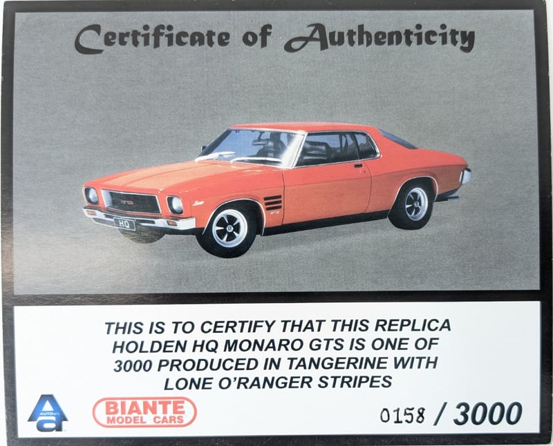 MODEL CAR 1:18, HOLDEN MONARO HQ GTS, #0158/3000 AUTOART.Item Size: Height: 14cm, Width: 37cm, Depth: 14cm, Weight: 1KgScale: 1:18Make/Model: Holden Monaro Hq GtsManufacturer: Biante/AutoartColour: Salamanca RedComes With Certificate Of Authenticity.Condition: Good - Refer To ImagesFC1162984+31