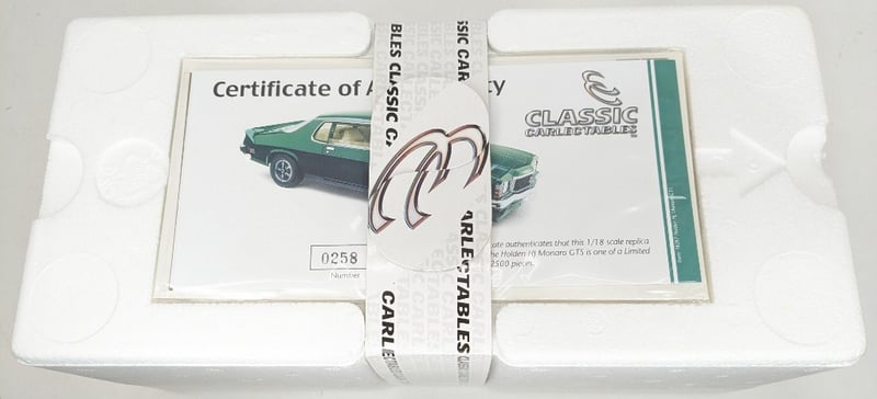 MODEL CAR 1:18, HOLDEN HJ MONARO GTS COUPE JADE GREEN METALLIC (308CI ENGINE), #0258/2500 CLASSIC CARLECTABLES.