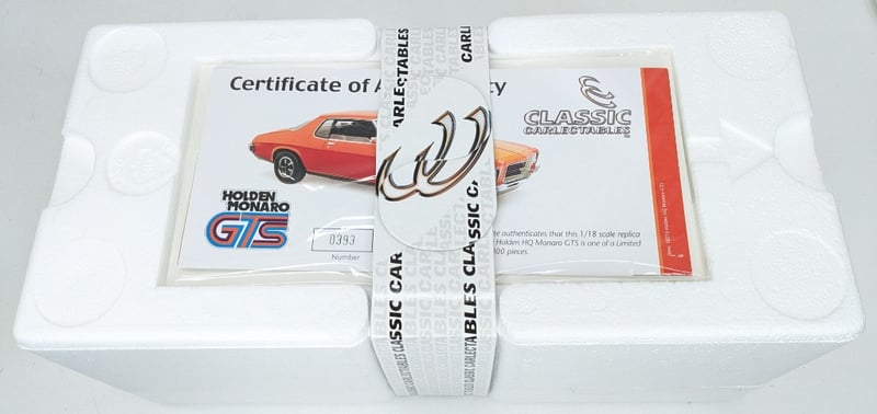 MODEL CAR 1:18, HOLDEN HQ MONARO GTS COUPE TANGERINE WITH LONE O'RANGER STRIPES (308CI ENGINE), #0393 CLASSIC CARLECTABLES.Item Size: Height: 17cm, Width: 34cm, Depth: 17cm, Weight: 1KgHolden Hq Monaro Gts Coupe Tangerine With Lone O'Ranger Stripes (308Ci Engine)Product Code: 18213Brand: Classic CarlectablesScale: 1:18Release Date: 1/02/2007Limited Edition Quantity: 3000Type: Road CarsComes With Certificate Of Authenticity.Condition: Good - Refer To ImagesFC1162984+95