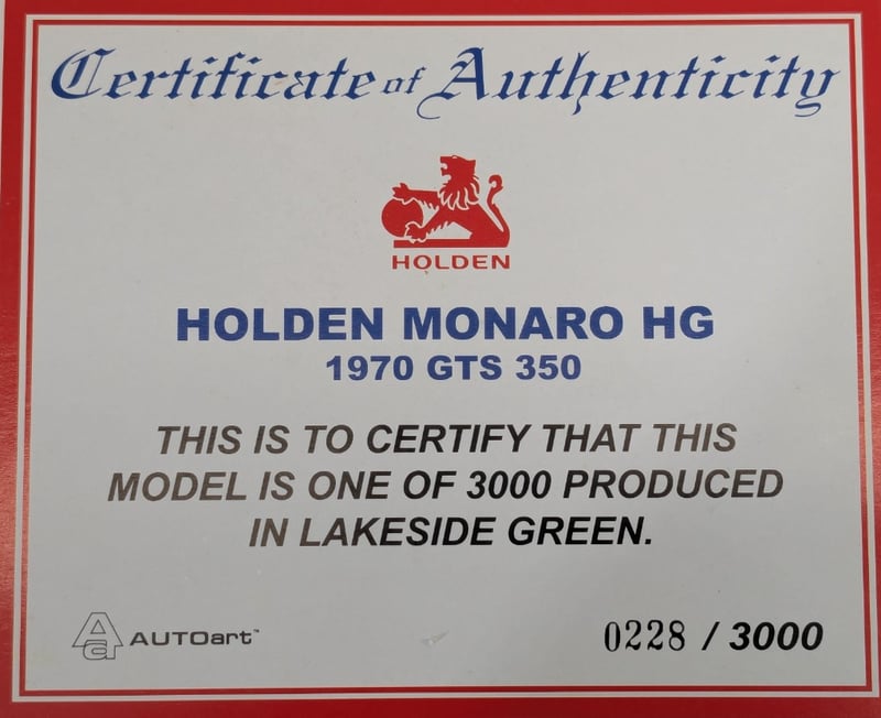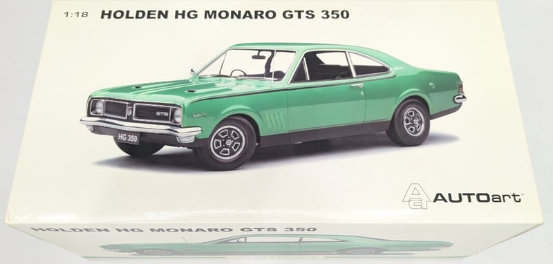 MODEL CAR 1:18, HOLDEN HG MONARO GTS 350, #0228/3000 AUTOART.Item Size: Height: 17cm, Width: 34cm, Depth: 17cm, Weight: 1KgMake/Model: Holden Hg Monaro Gts 350Scale: 1:18Colour: Lakeside GreenLimited Edition: Tba PiecesManufacturer: AutoartComes With Certificate Of AuthenticityCondition: Good - Refer To ImagesFC1162984+116