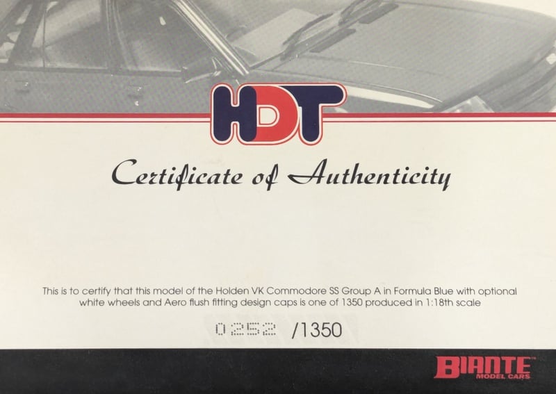 MODEL CAR 1:18 HOLDEN VK COMMODORE SS GROUP A, #0252/1350 BIANTEItem Size: Height: 17cm, Width: 34cm, Depth: 17cm, Weight: 1KgScale: 1:18Make/Model: Holden Vk Commodore Ss Group AColour: Formula Blue W/Silver WheelsManufacturer: Biante / AutoartComes With Certificate Of AuthenticityCondition: Good - Refer To ImagesFC1162984+118