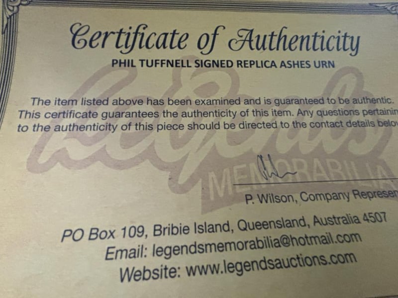 PHIL TUFNELL SIGNED ASHES URN Phil Tufnell Personally Signed Replica Ashes Urn.The Item Is Accompanied By A Certificate Of Authenticity. Size: 25 x 20 x 10 Condition: Good - Refer To Images 585033+22