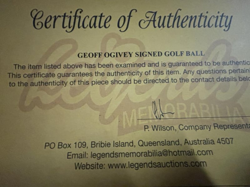 GEOFF OGILVEY SIGNED GOLF BALLUs Open Champion (2006) Geoff Ogilvy Personally Signed Golf Ball In Display Case. The Item Is Accompanied By A Certificate Of Authenticity.Size: 25 x 20 x 10Condition: Good - Refer To Images585033+36