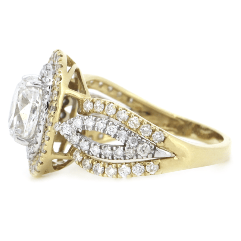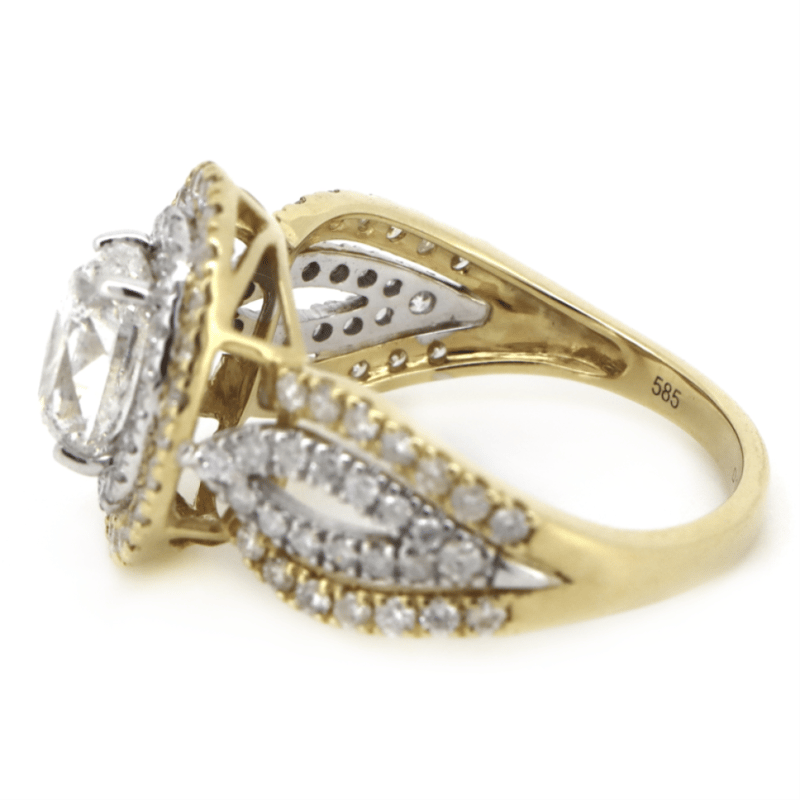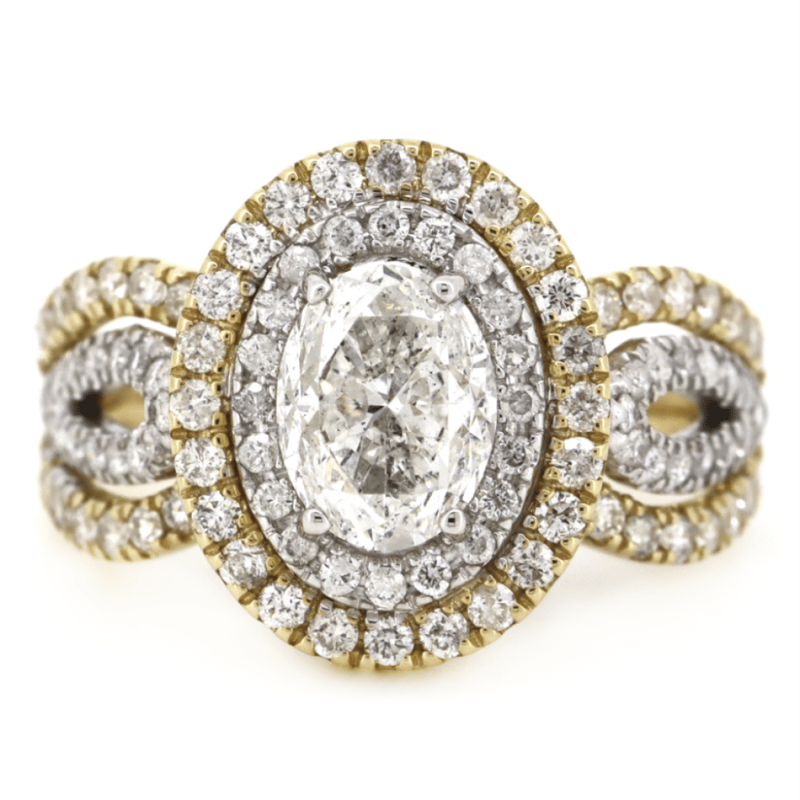 14K YELLOW/WHITE GOLD AND DIAMOND, DOUBLE HALO SPLIT BAND RING.