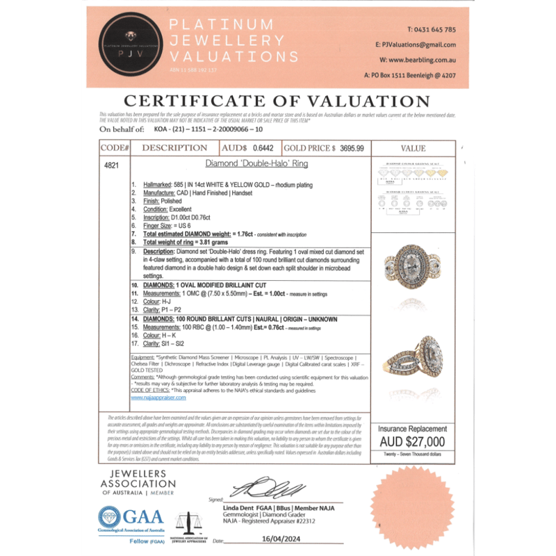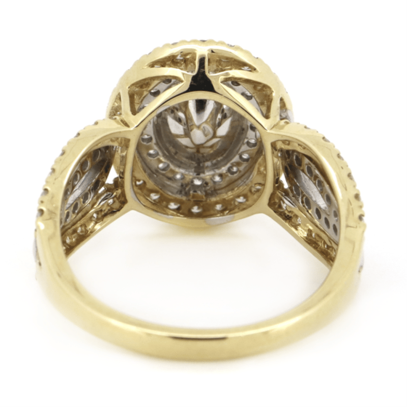 The Centre Features, One Oval Modified Brilliant Cut, Diamond (1.00Ct, H-J Colour, P1-P2 Clarity), 4 Claw Set. Encompassing The Centre Are, 100 Round Brilliant Cut, Diamonds (0.76Ct Tdw, H-K Colour, Si1-Si2 Clarity), Micro-Bead Set In Yellow/White Gold. Ring Size L 1/2.