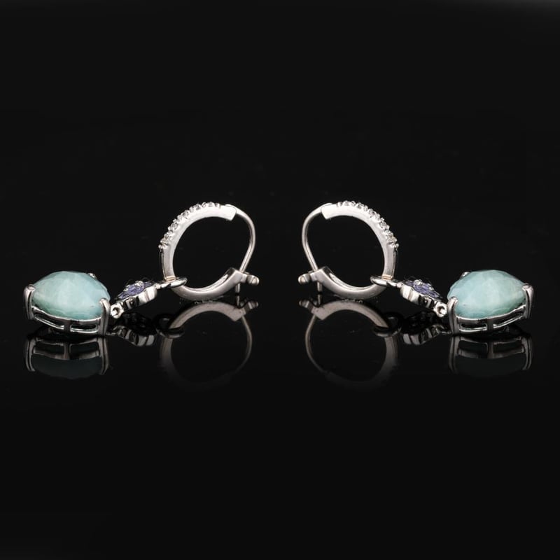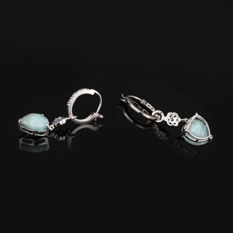 Ethereal Serenity: Milky Aquamarine and Tanzanite Earrings Embrace the tranquil elegance of these exquisite earrings, featuring two mesmerizing heart-shaped milky aquamarines, each a sumptuous 10.00mm in size. Their soft, dreamy hue evokes the calmness of the ocean, capturing the essence of serenity and grace. Surrounding these enchanting stones are fourteen radiant round tanzanites, each 1.50mm, which add a touch of royal allure and depth, their vibrant violet-blue tones contrasting beautifully against the ethereal aquamarine. To further enhance the brilliance of this stunning piece, ten sparkling white topaz stones, each 0.90mm, are intricately set in a straight post design, providing a touch of luminosity that dances with every movement. The harmonious combination of these meticulously selected gemstones creates a visual symphony that is both sophisticated and captivating. Perfect for those special occasions or simply to elevate your everyday elegance, these earrings are a testament to timeless beauty and refined craftsmanship. Adorn yourself with these treasures and let their enchanting aura become a cherished part of your jewelry collection.